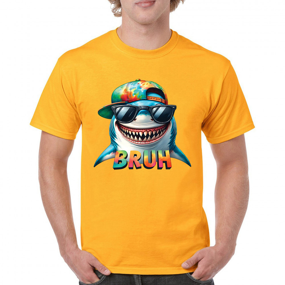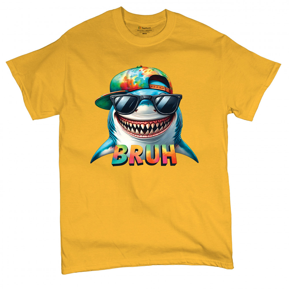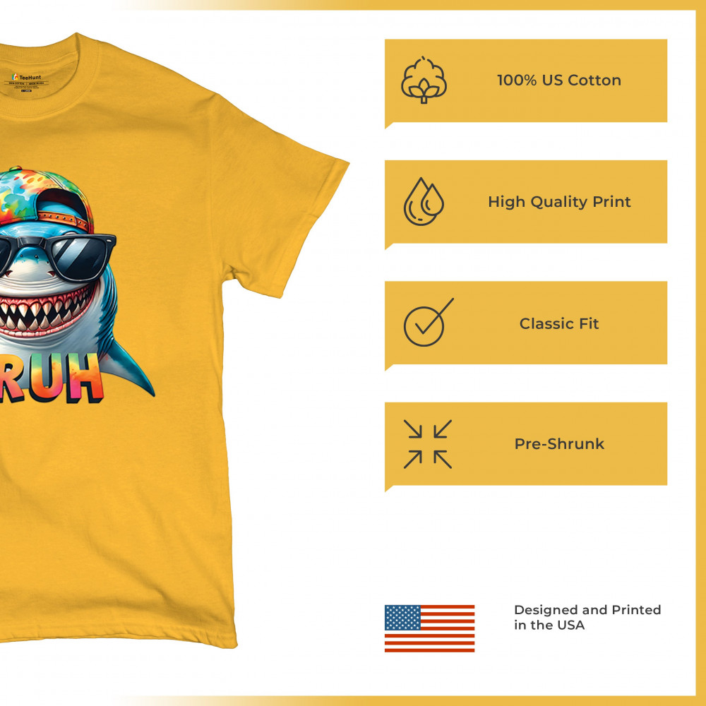 Bruh Shark meme shirt with Gen Z humor, cartoon shark design, summer beach vibes, Sigma Aura, and Italian Brainrot internet humor.