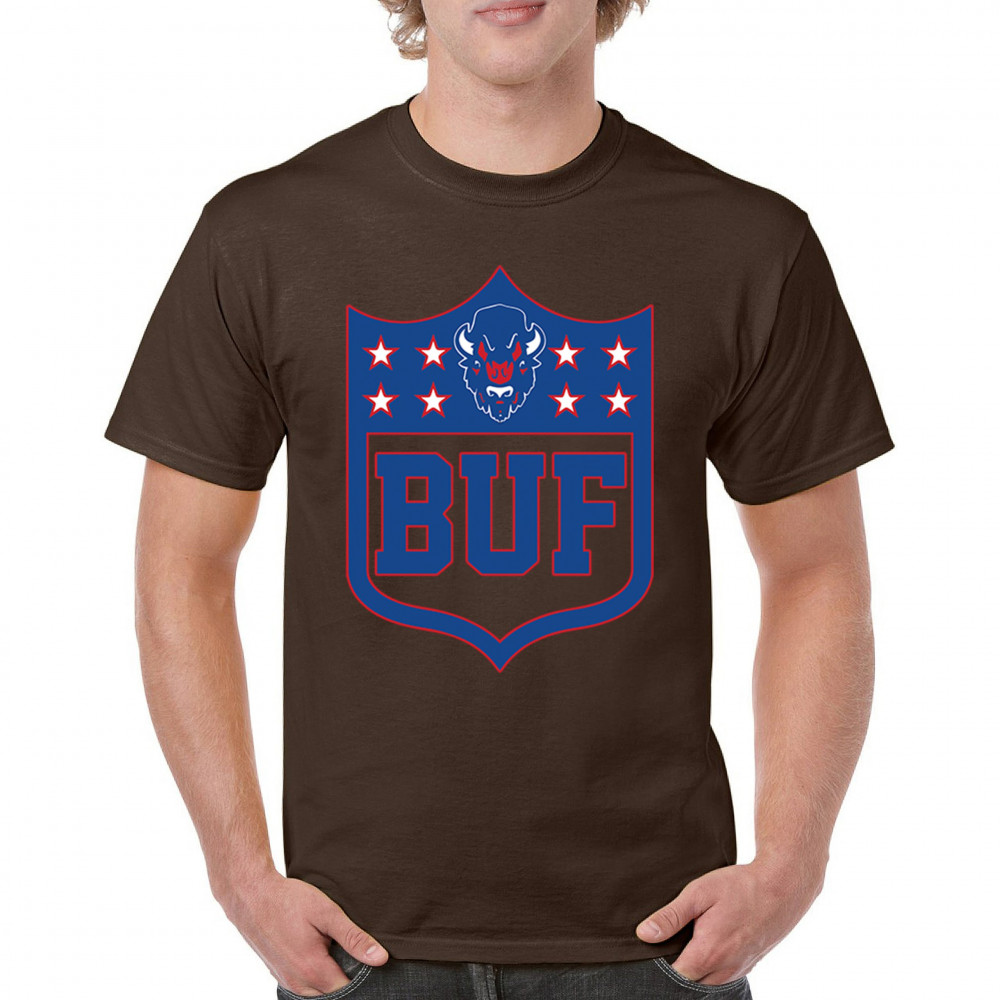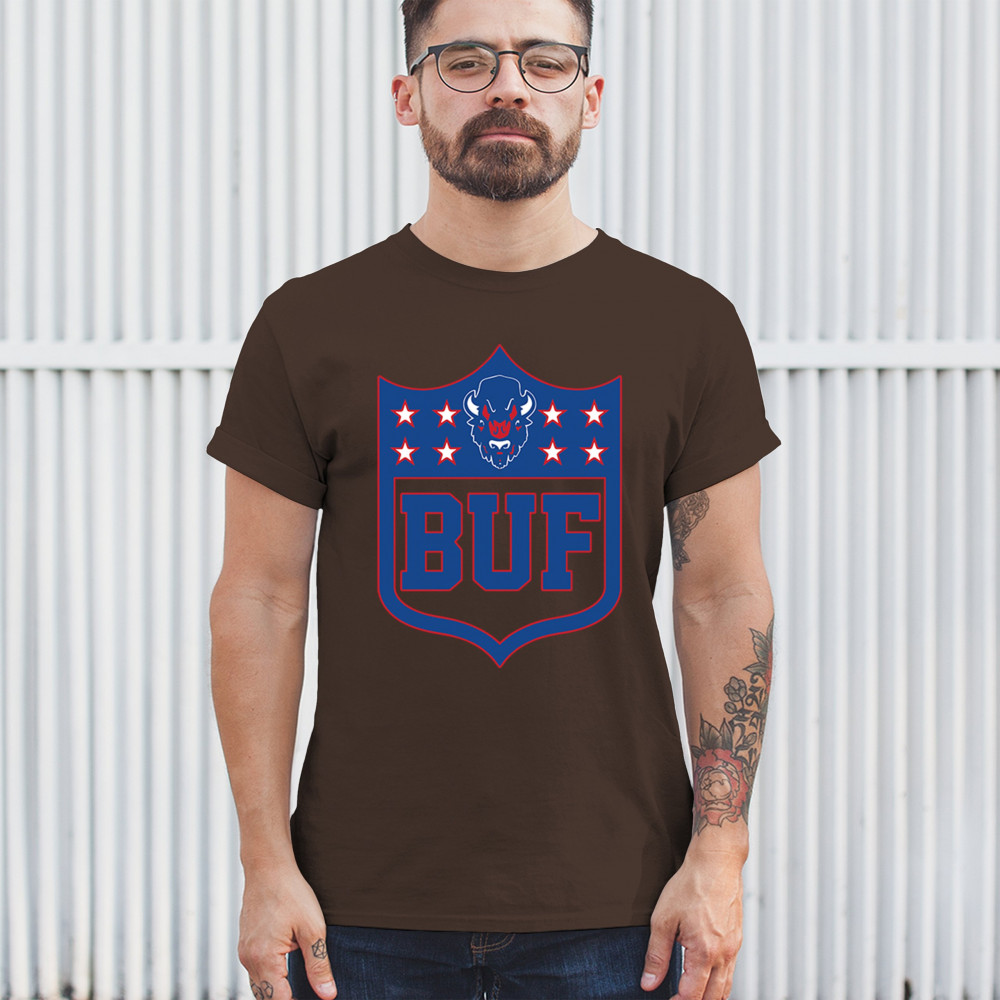 Bold Buffalo bison shield design for game day gear, tailgating, Sunday football, and championship pride in The Queen City.