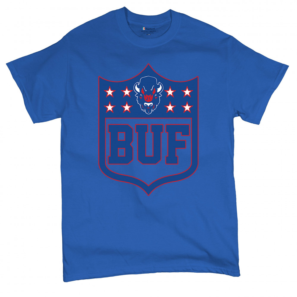 Bold Buffalo bison shield design for game day gear, tailgating, Sunday football, and championship pride in The Queen City.