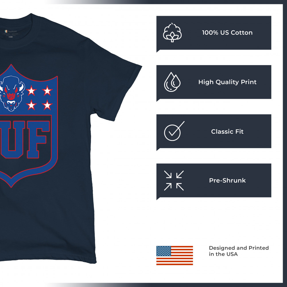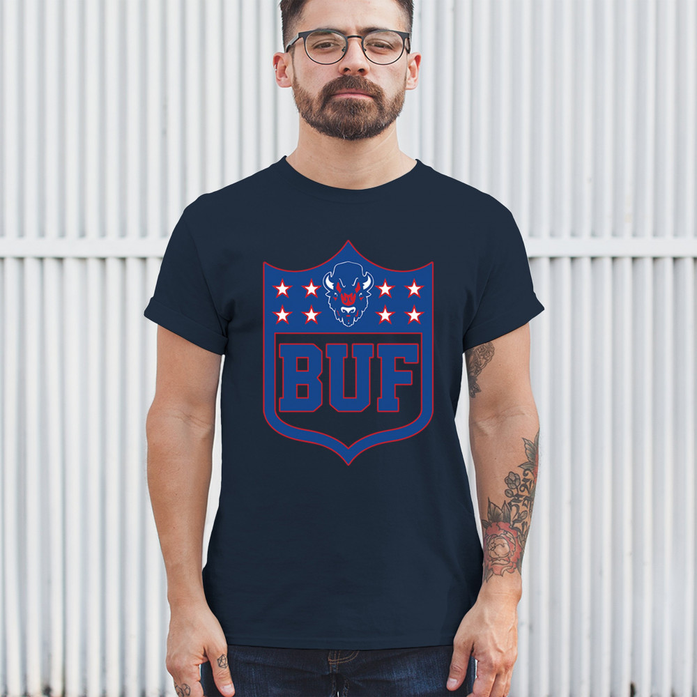 Bold Buffalo bison shield design for game day gear, tailgating, Sunday football, and championship pride in The Queen City.