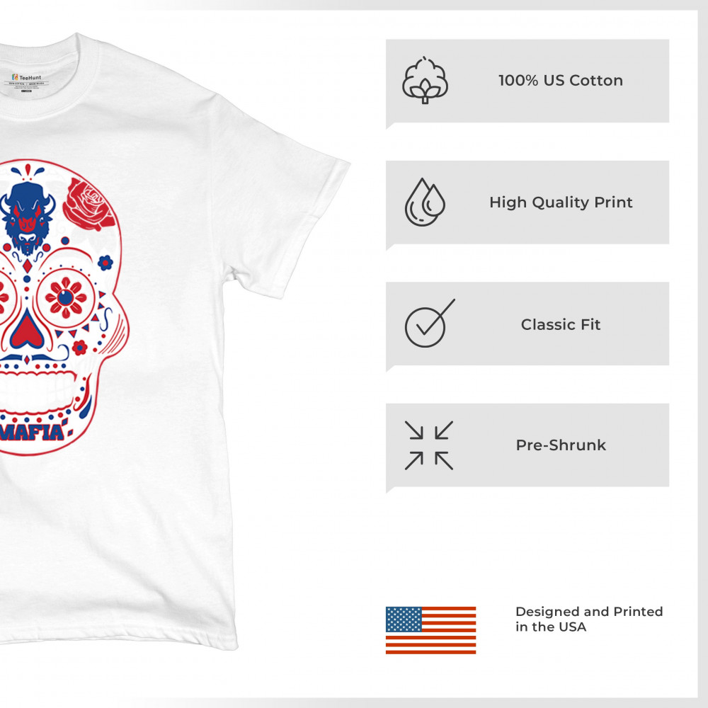 Celebrate Buffalo football with this Sugar Skull design inspired by Dia de los Muertos. Featuring NY Bleed Blue toughness, Northern Grit, and Queen City spirit, it’s made for tailgate parties, playoff energy, and fantasy football rivalries. A bold calavera for true Buffalo fans who live Game Day pride.