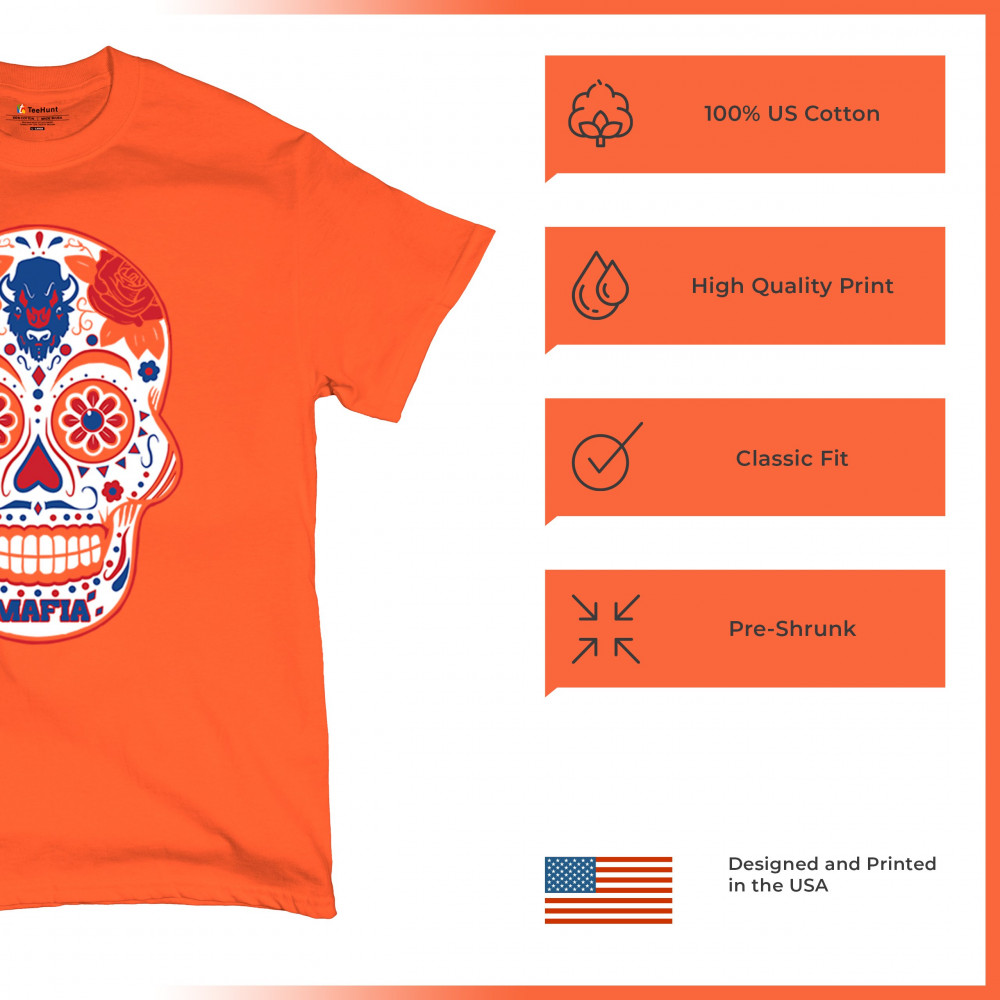 Celebrate Buffalo football with this Sugar Skull design inspired by Dia de los Muertos. Featuring NY Bleed Blue toughness, Northern Grit, and Queen City spirit, it’s made for tailgate parties, playoff energy, and fantasy football rivalries. A bold calavera for true Buffalo fans who live Game Day pride.