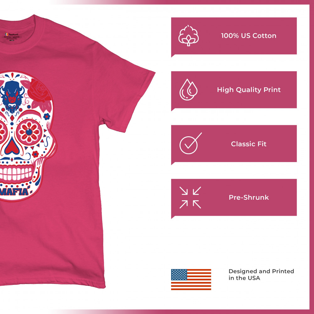 Celebrate Buffalo football with this Sugar Skull design inspired by Dia de los Muertos. Featuring NY Bleed Blue toughness, Northern Grit, and Queen City spirit, it’s made for tailgate parties, playoff energy, and fantasy football rivalries. A bold calavera for true Buffalo fans who live Game Day pride.
