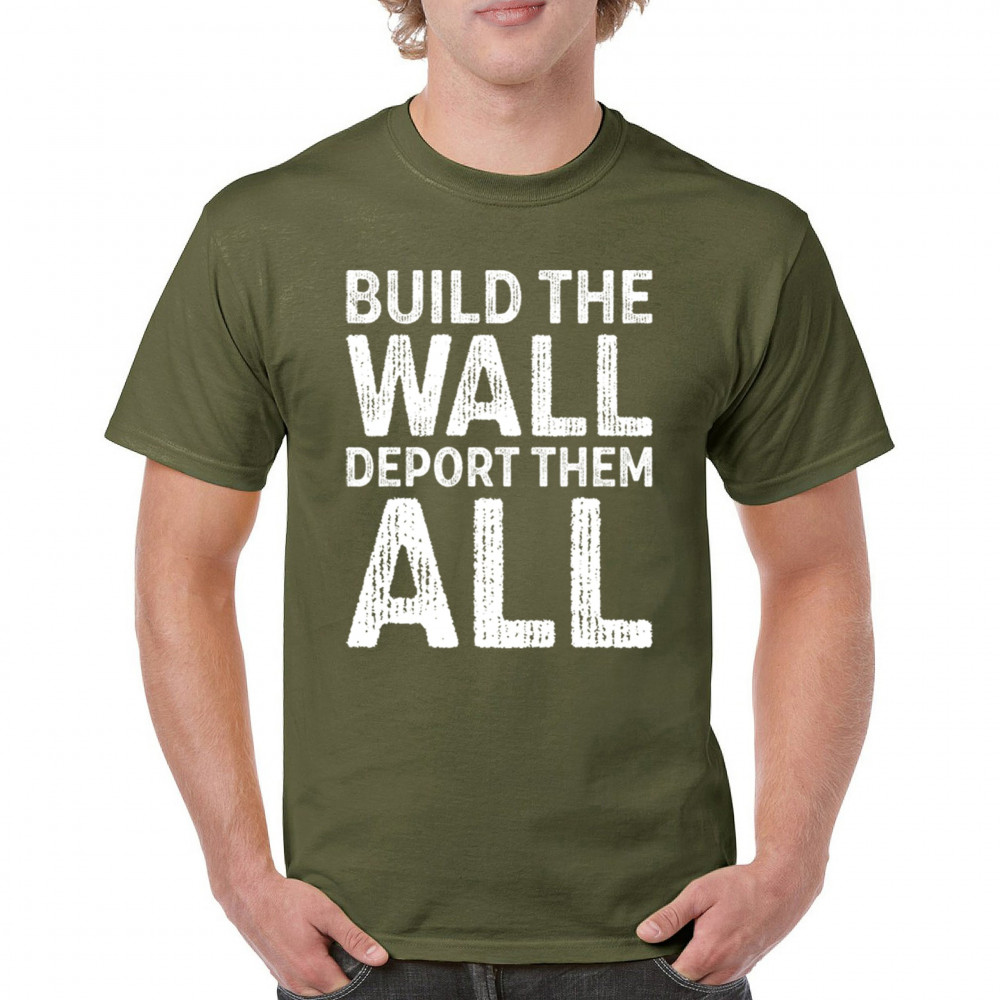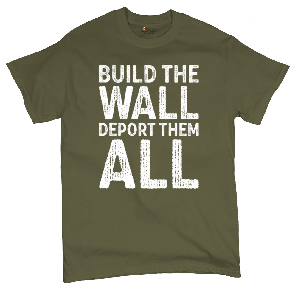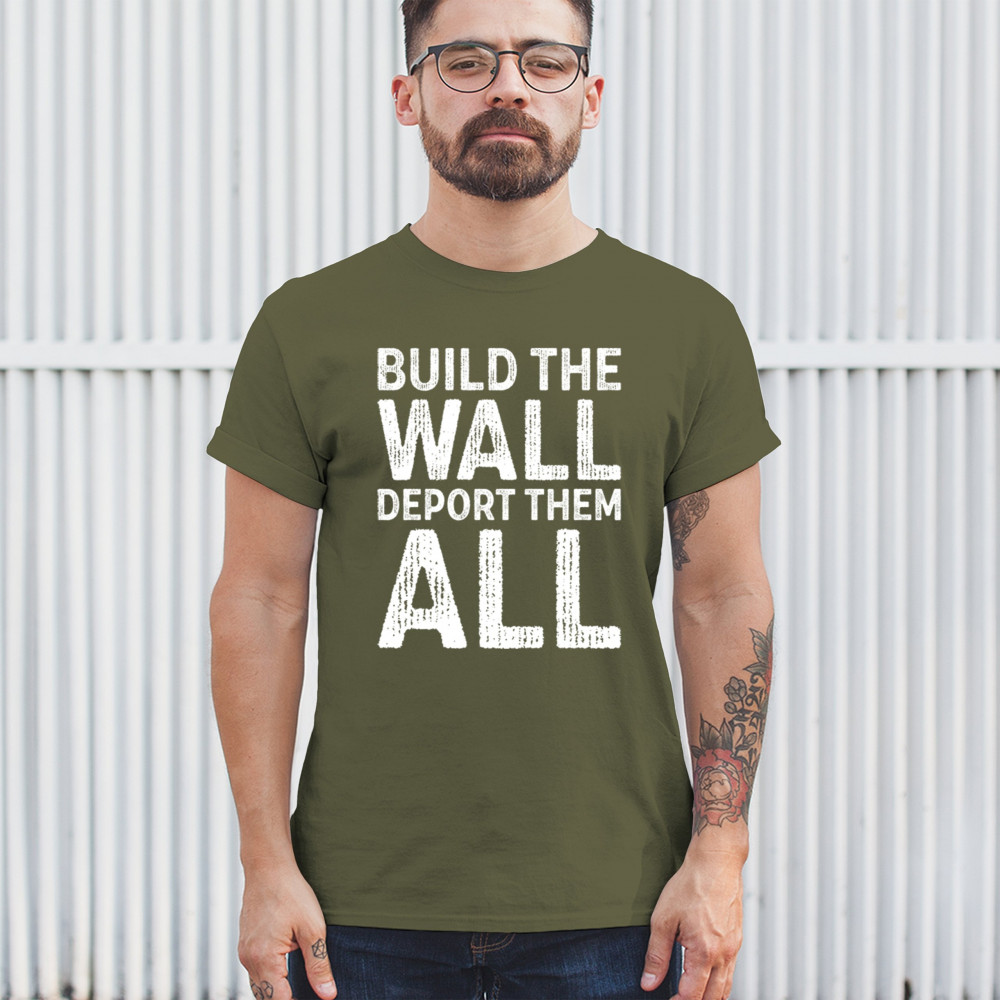 Stand strong for border security with our 'Build the Wall Deport Them All Trump 2024' tee. As a proud Trump supporter, join the America First movement and champion conservative values. Trust in God, not government, and reject the failed policies of Sleepy Joe. Let's go Brandon! Let the American flag wave high as we rally for victory in 2024.