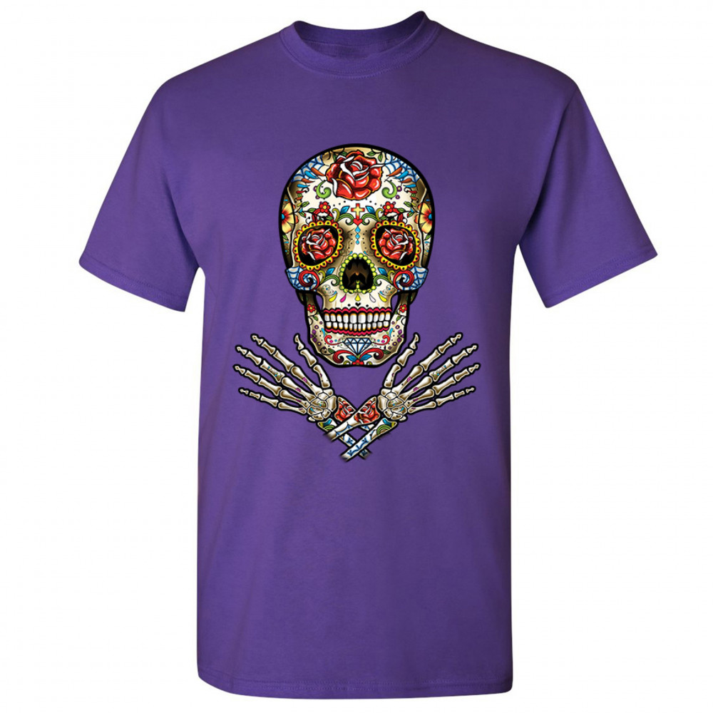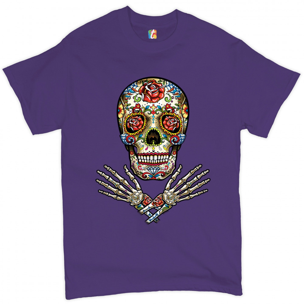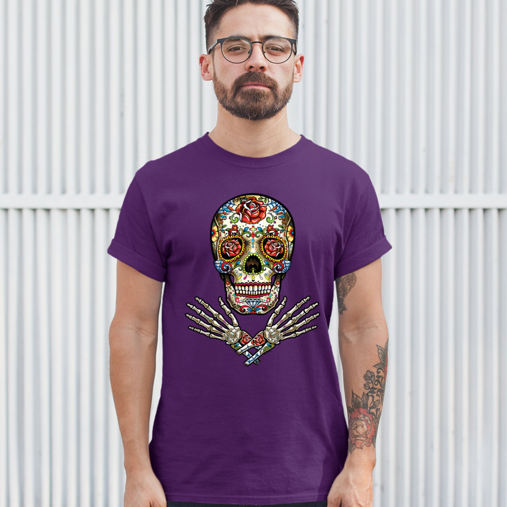 A huge print featuring a big calavera with roses in the eye sockets. There is a cross between the eyes and a huge rose on the forehead. Below the skull there are crossed arms. A great choice for anyone who upholds the traditions and celebrates the Day of