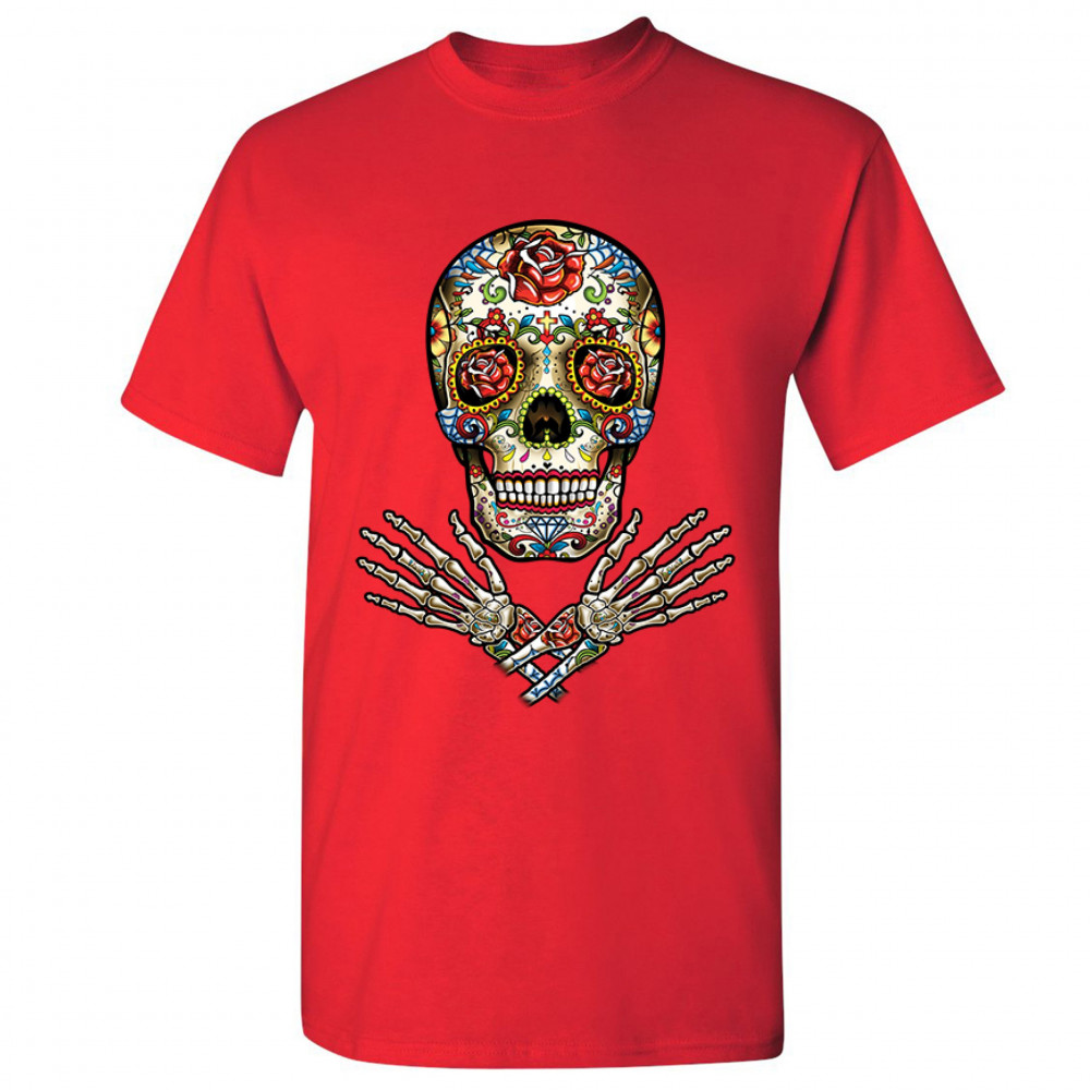 A huge print featuring a big calavera with roses in the eye sockets. There is a cross between the eyes and a huge rose on the forehead. Below the skull there are crossed arms. A great choice for anyone who upholds the traditions and celebrates the Day of