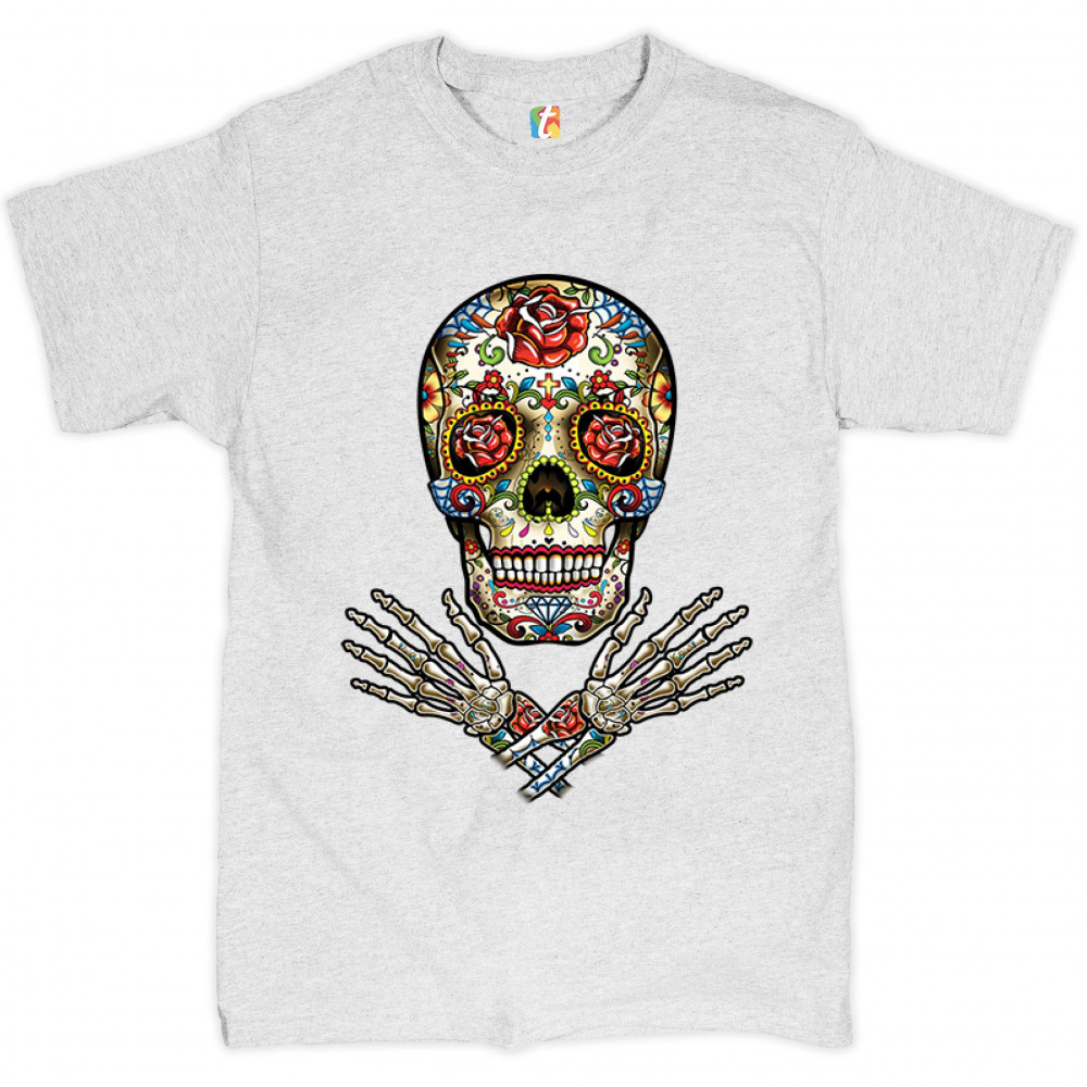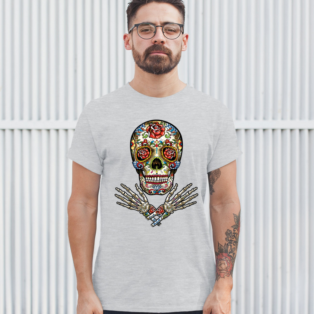 A huge print featuring a big calavera with roses in the eye sockets. There is a cross between the eyes and a huge rose on the forehead. Below the skull there are crossed arms. A great choice for anyone who upholds the traditions and celebrates the Day of