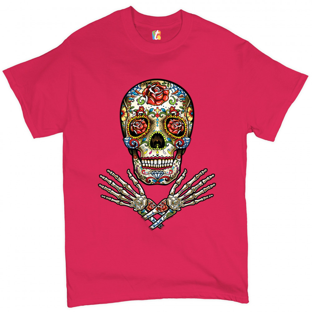 A huge print featuring a big calavera with roses in the eye sockets. There is a cross between the eyes and a huge rose on the forehead. Below the skull there are crossed arms. A great choice for anyone who upholds the traditions and celebrates the Day of