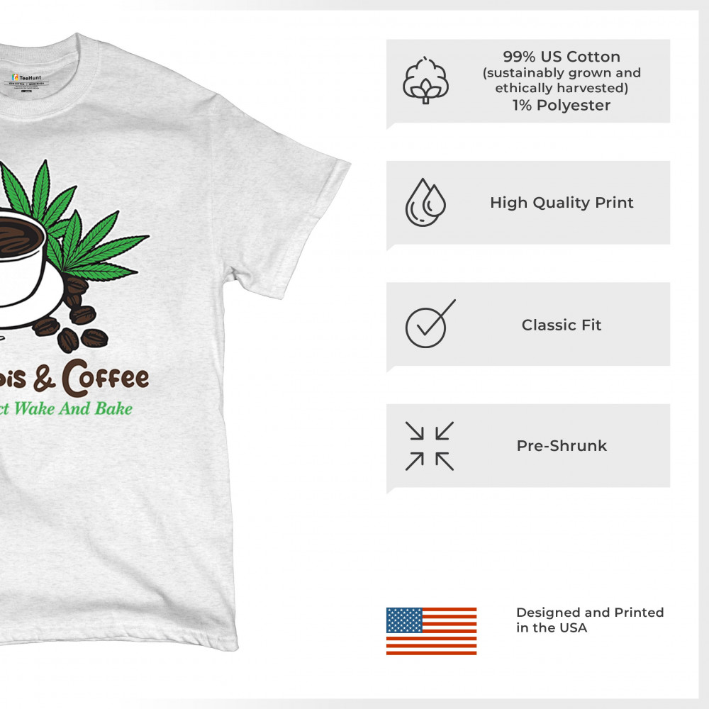 A chill cannabis and coffee design with cup, joints, and beans. Great for wake-and-bake fans, mellow mornings, and herb-fueled coffee lovers.