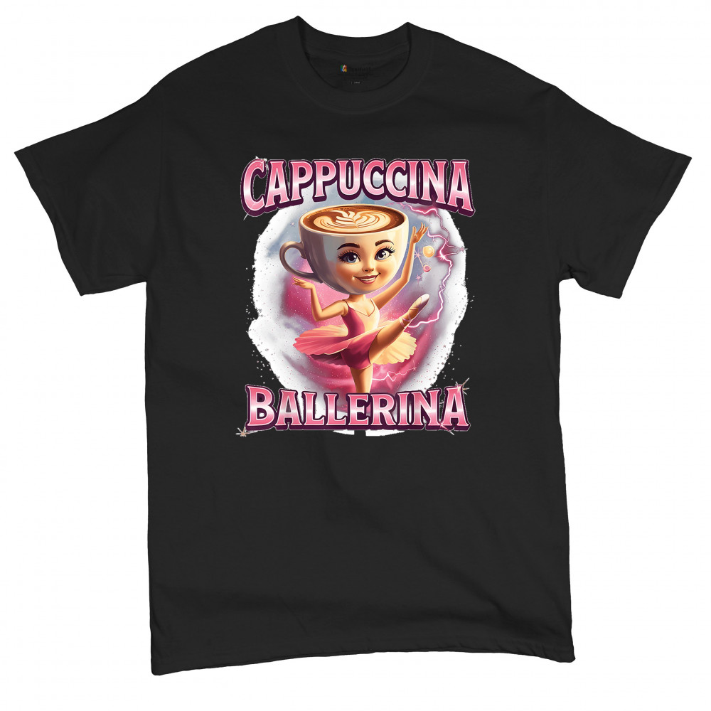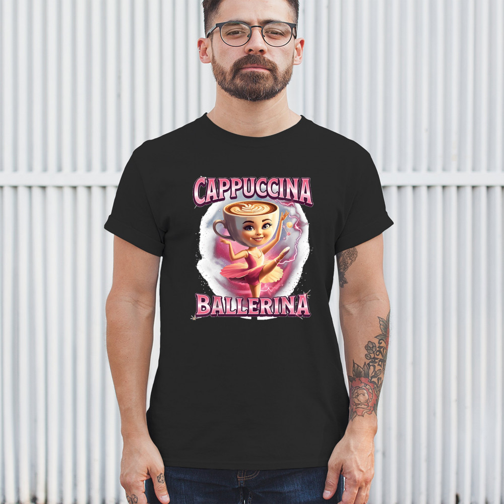 Cappuccina Ballerina is your perfect mix of meme chaos and coffee-core fashion. This absurd design features a ballet-dancing cappuccino head with weirdcore flair and Gen Z humor. A surreal blend of ironic internet fashion, TikTok trends, and espresso madness—ideal for meme lovers, caffeine addicts, and viral absurdists alike.