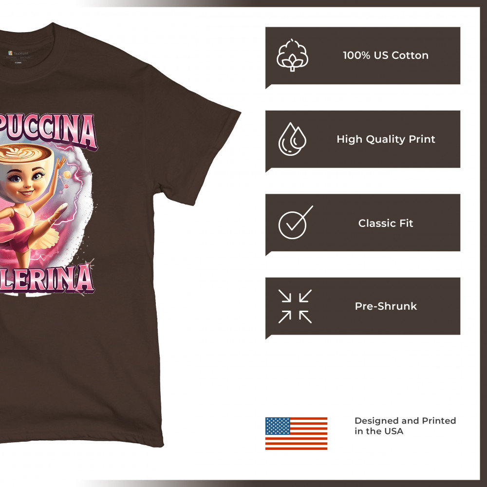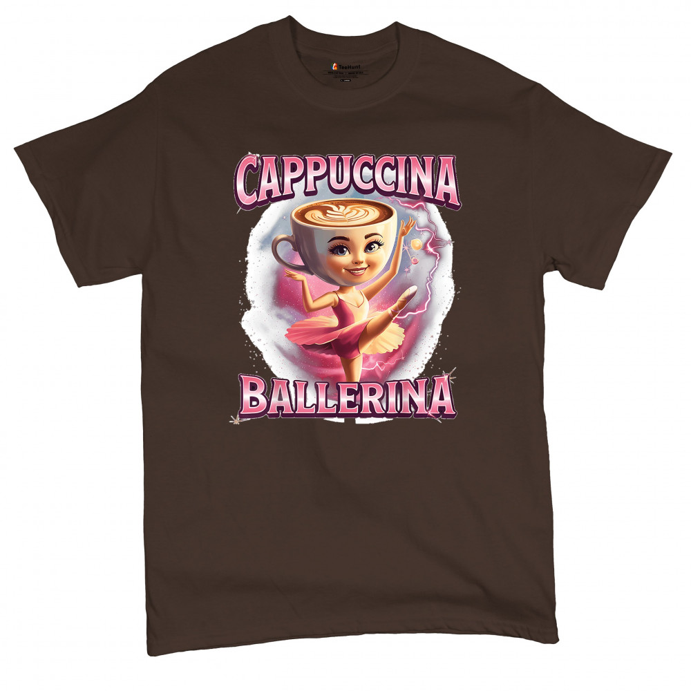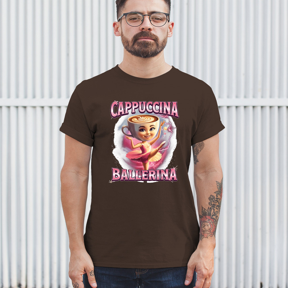 Cappuccina Ballerina is your perfect mix of meme chaos and coffee-core fashion. This absurd design features a ballet-dancing cappuccino head with weirdcore flair and Gen Z humor. A surreal blend of ironic internet fashion, TikTok trends, and espresso madness—ideal for meme lovers, caffeine addicts, and viral absurdists alike.