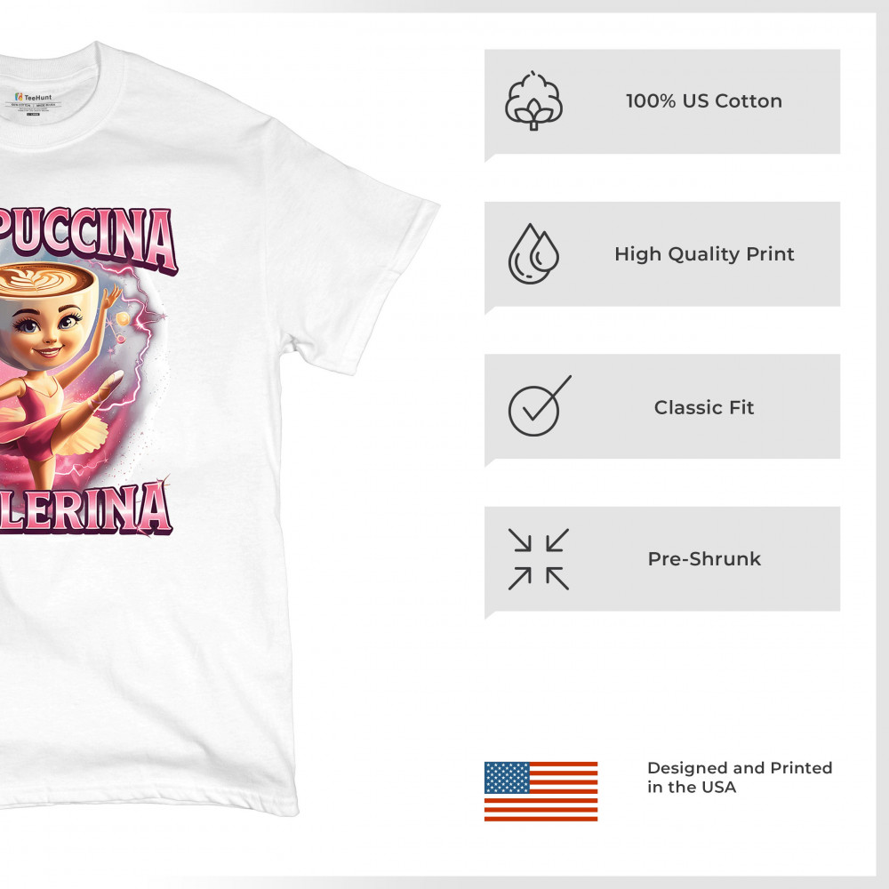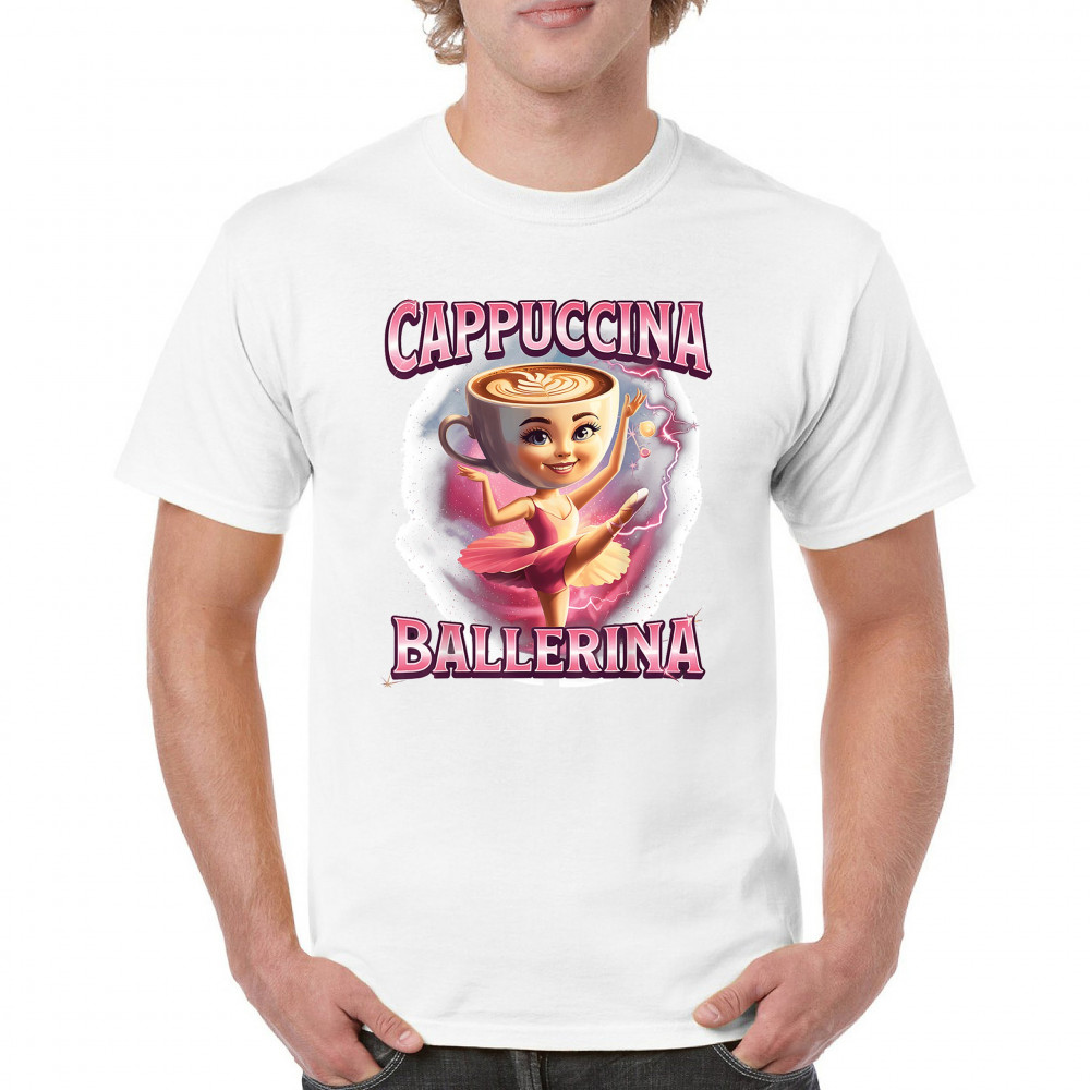 Cappuccina Ballerina is your perfect mix of meme chaos and coffee-core fashion. This absurd design features a ballet-dancing cappuccino head with weirdcore flair and Gen Z humor. A surreal blend of ironic internet fashion, TikTok trends, and espresso madness—ideal for meme lovers, caffeine addicts, and viral absurdists alike.