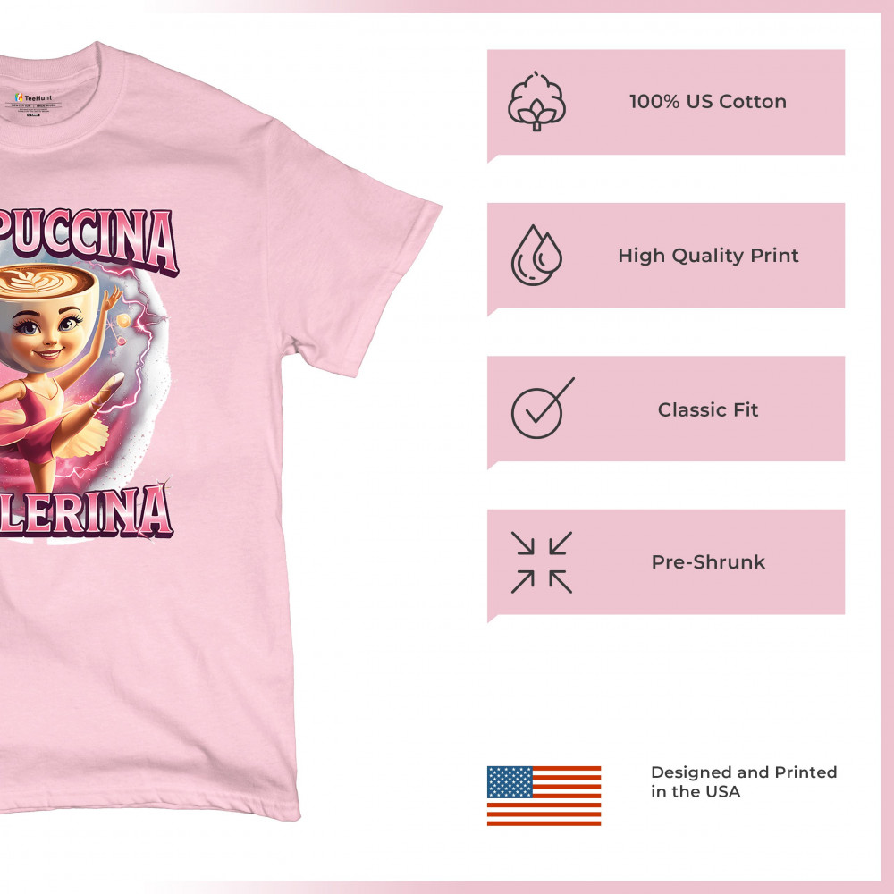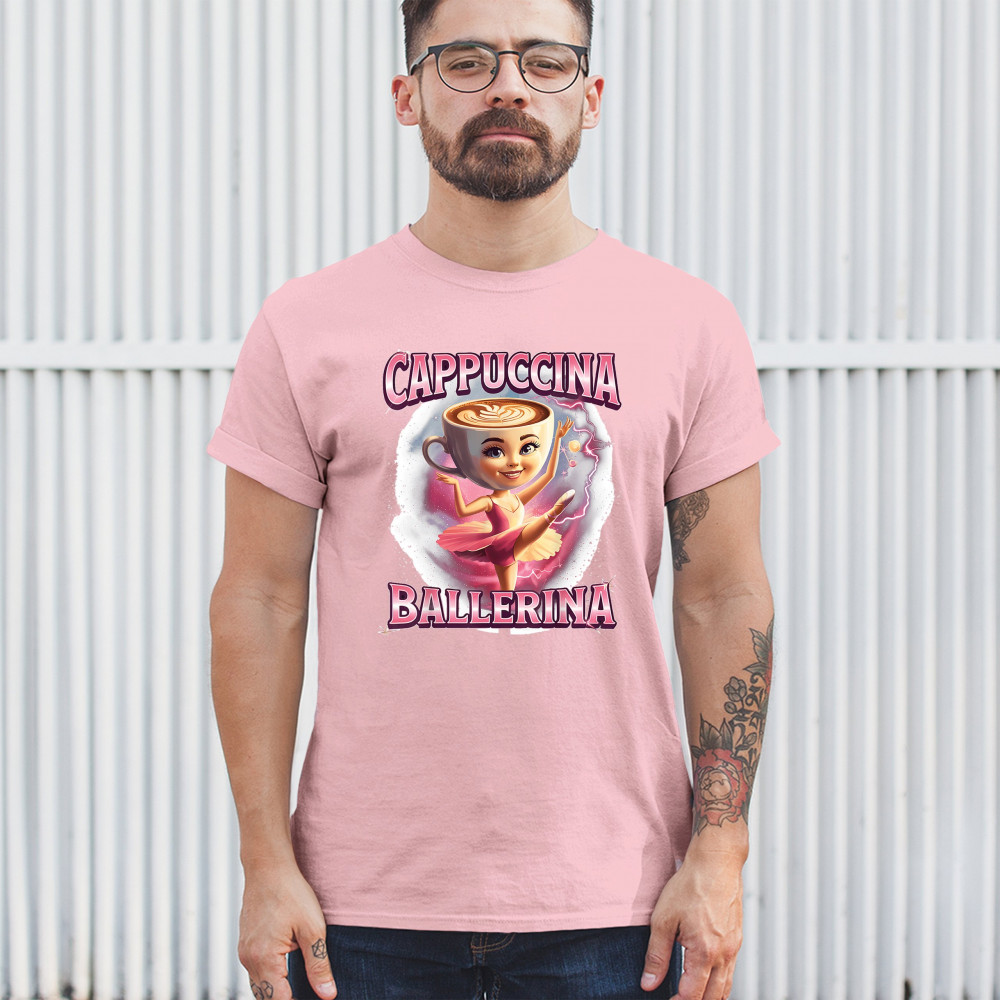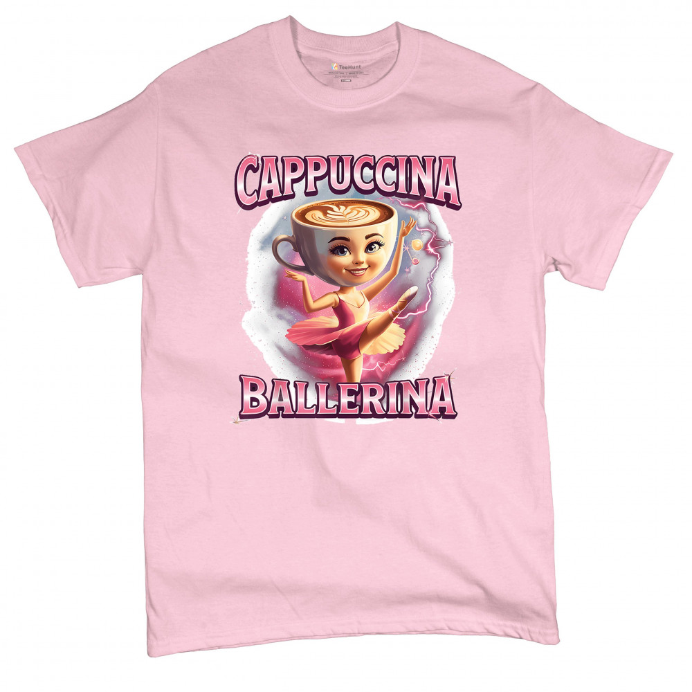 Cappuccina Ballerina is your perfect mix of meme chaos and coffee-core fashion. This absurd design features a ballet-dancing cappuccino head with weirdcore flair and Gen Z humor. A surreal blend of ironic internet fashion, TikTok trends, and espresso madness—ideal for meme lovers, caffeine addicts, and viral absurdists alike.