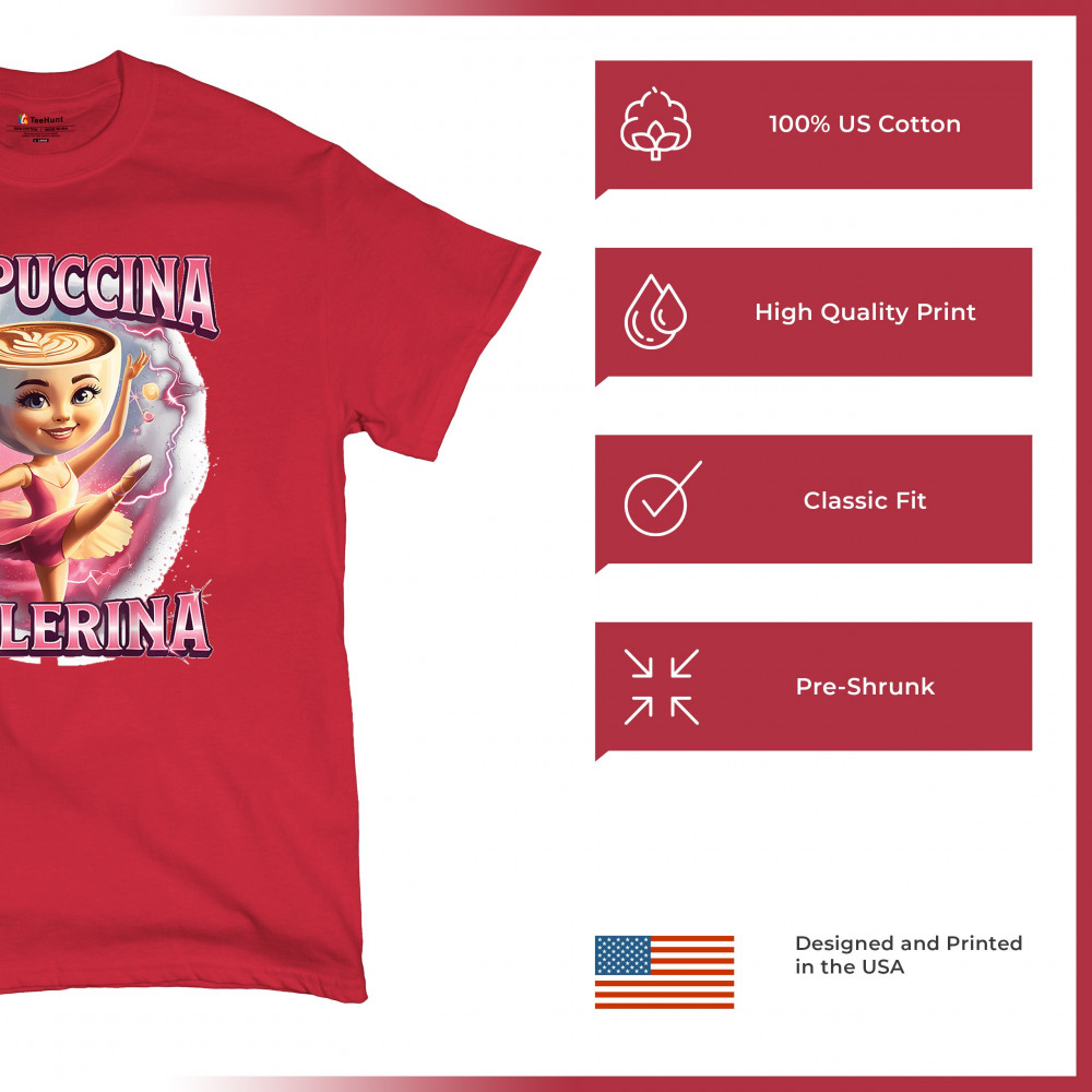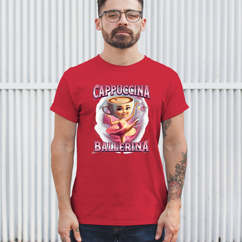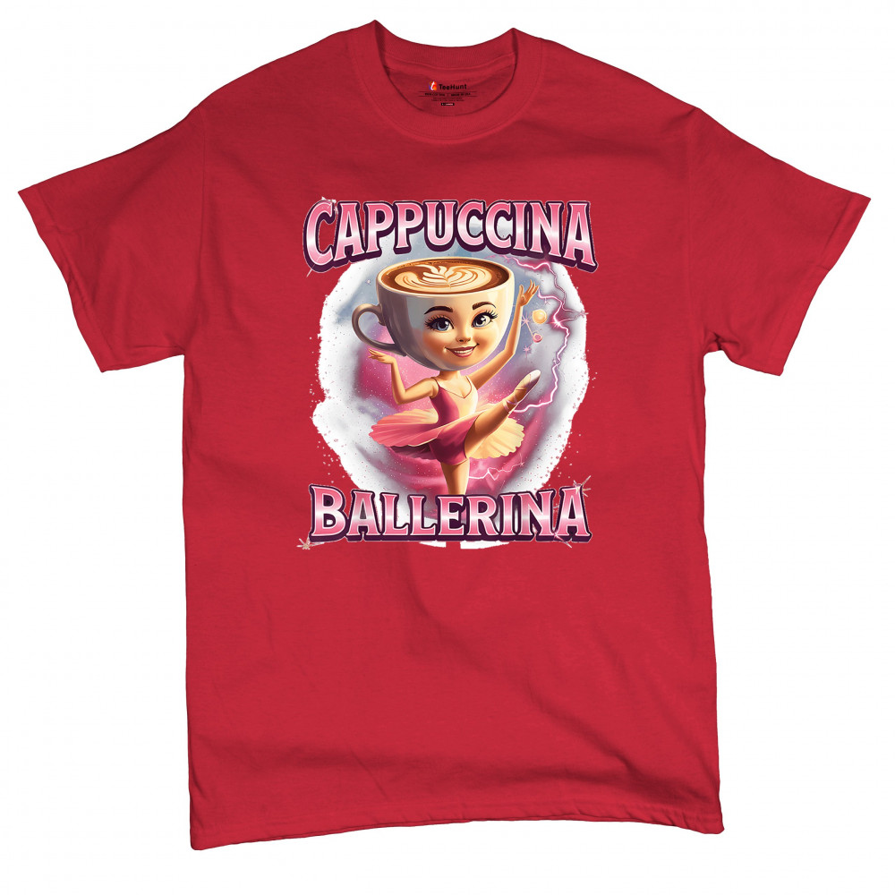 Cappuccina Ballerina is your perfect mix of meme chaos and coffee-core fashion. This absurd design features a ballet-dancing cappuccino head with weirdcore flair and Gen Z humor. A surreal blend of ironic internet fashion, TikTok trends, and espresso madness—ideal for meme lovers, caffeine addicts, and viral absurdists alike.