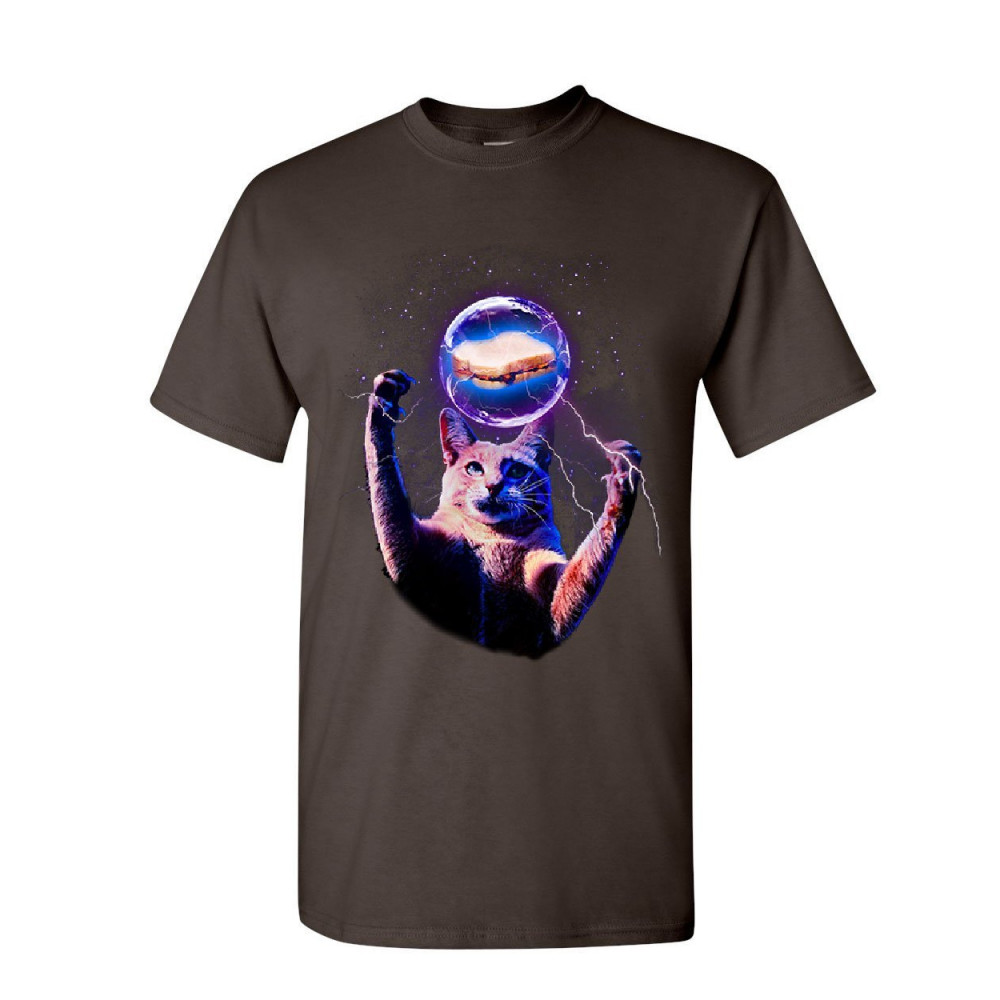 CAT CATCHING A PB&J cat catching a sandwich t-shirt plasma ball kitty kitten weird mens tee shirt brown