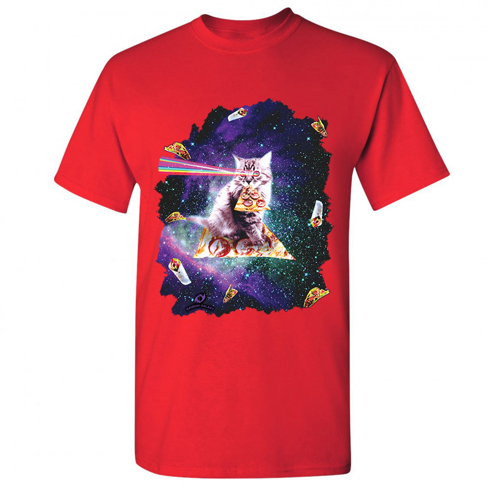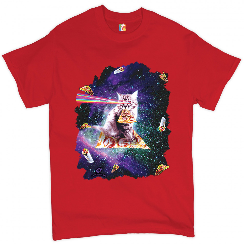 A print featuring a cat flying through space on a slice of pizza holding another slice in it's mouth while firing rainbow lasers from it's eyes. The cat is surrounded by burritos and shawarmas. A great choice for anyone who is into cats, space and weird s