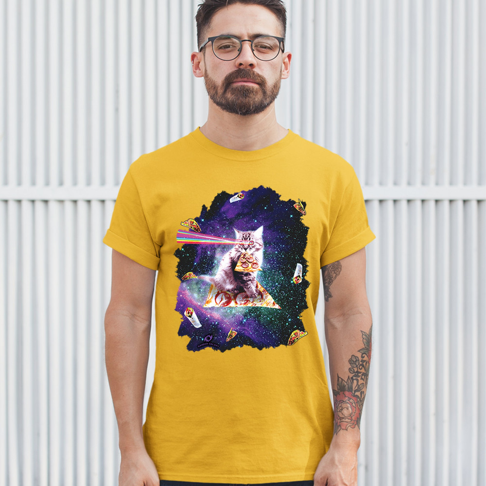 A print featuring a cat flying through space on a slice of pizza holding another slice in it's mouth while firing rainbow lasers from it's eyes. The cat is surrounded by burritos and shawarmas. A great choice for anyone who is into cats, space and weird s