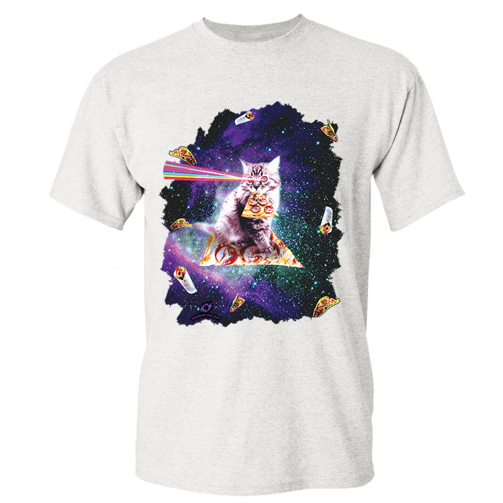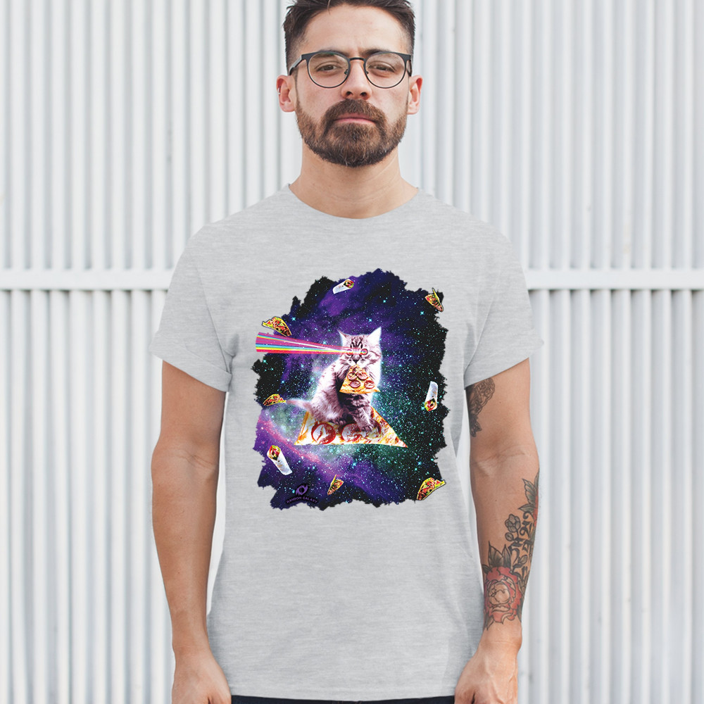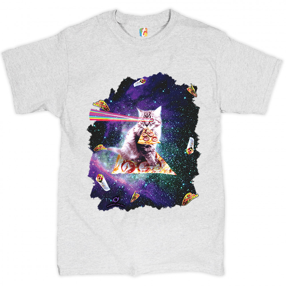 CAT FIRING RAINBOW LASER RIDING PIZZA SLICE IN SPACE t-shirt weird men's tee ash gray