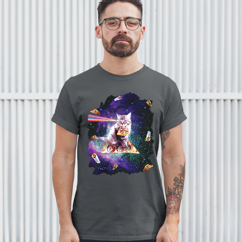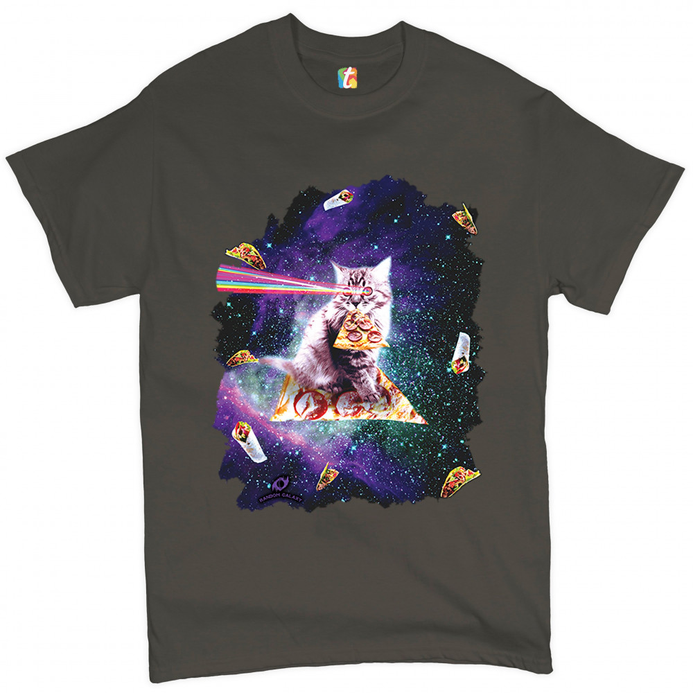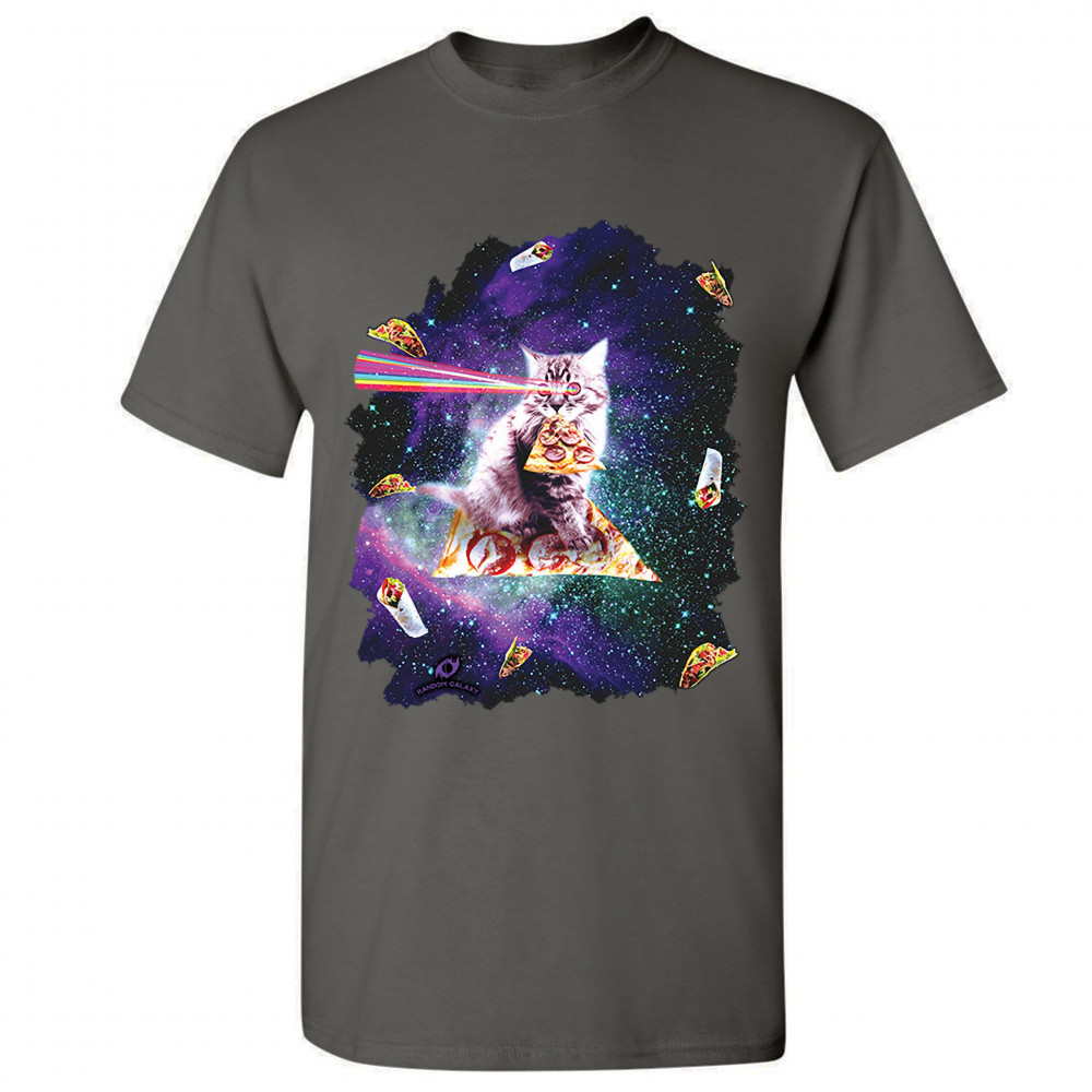CAT FIRING RAINBOW LASER RIDING PIZZA SLICE IN SPACE t-shirt weird men's tee charcoal
