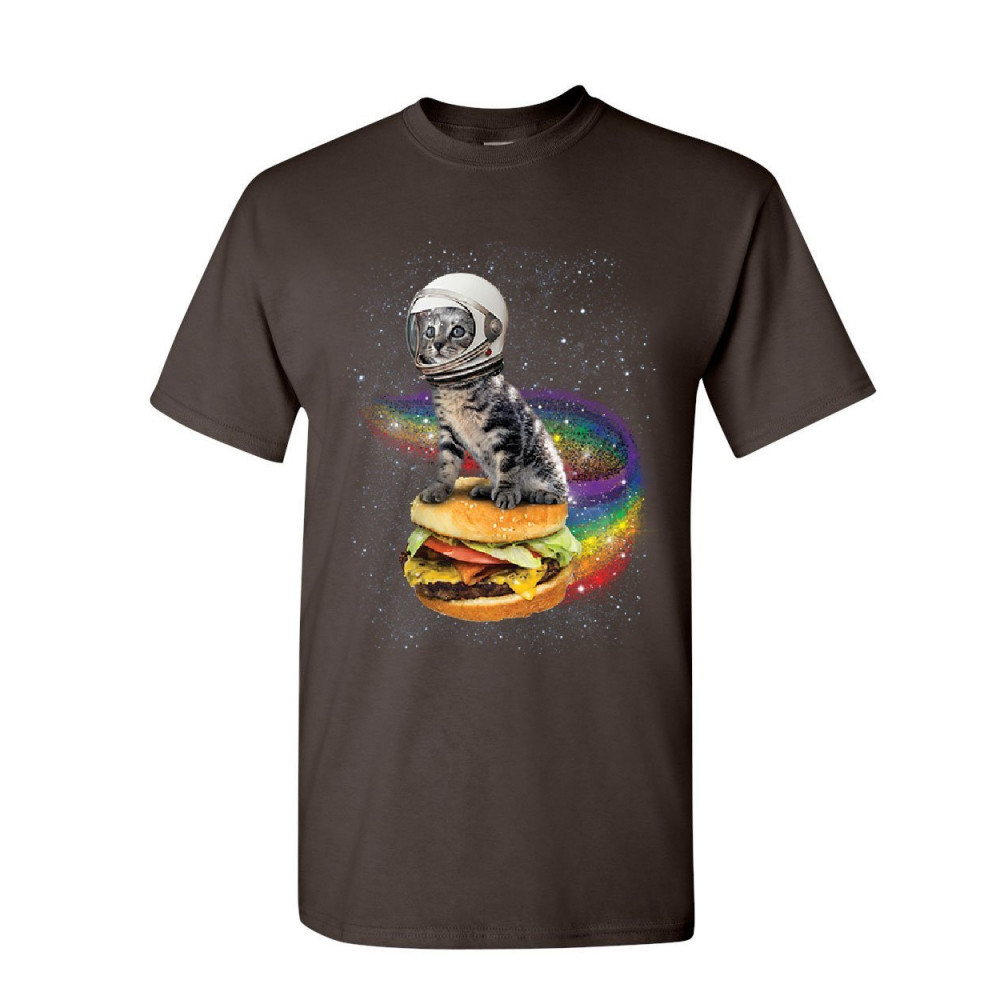 CAT FLYING A RAINBOW BURGER t-shirt funny astronaut kitten space mens tee shirt brown