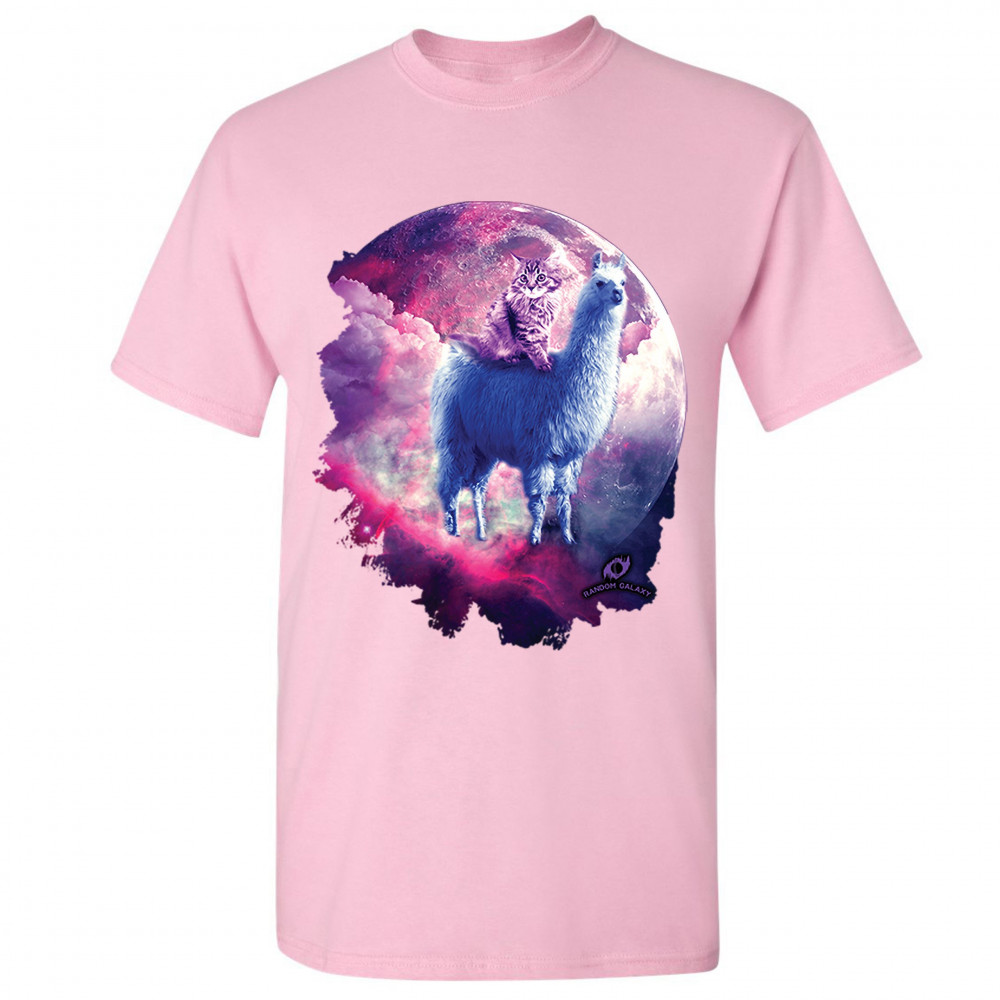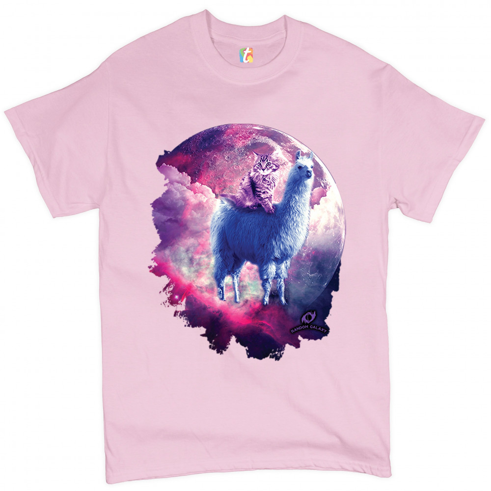 CAT RIDING A LLAMA IN SPACE t-shirt weird galaxy moon creative men's tee light pink
