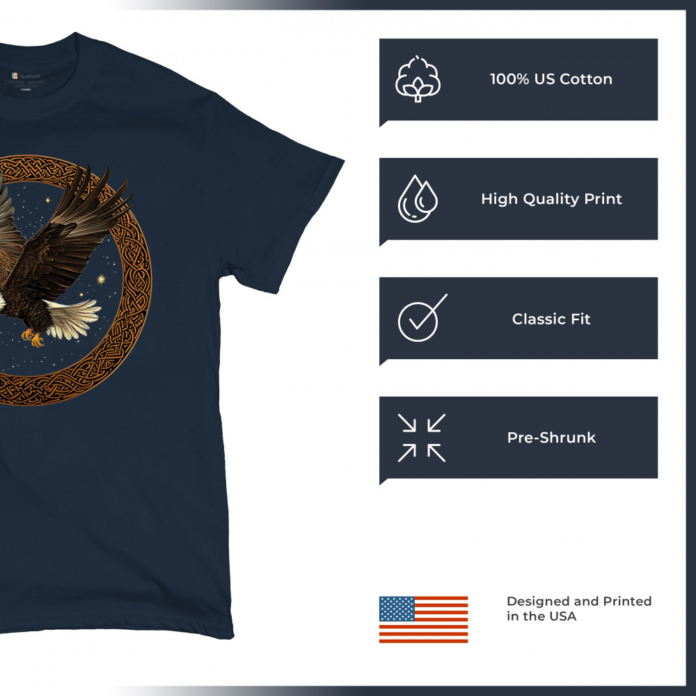 This powerful bald eagle takes flight within a Celtic knotwork circle, radiating strength, independence, and cosmic energy. The glowing stars and celestial background add mystic symbolism, blending nature, tribal design, and spirituality. Perfect for patriots, spiritual seekers, and bird enthusiasts.