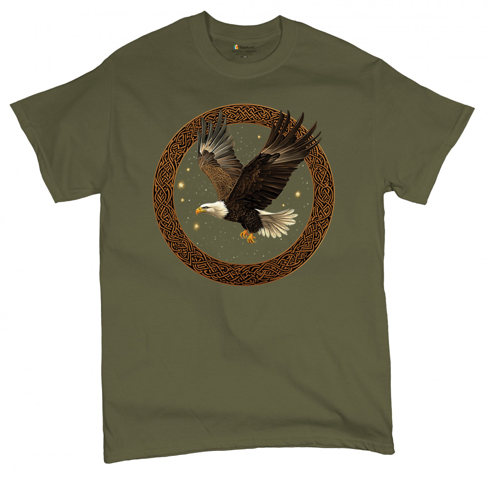 Bald eagle flying in Celtic circle with stars. A bold symbol of freedom, spiritual power, and protection—perfect for patriots and seekers.