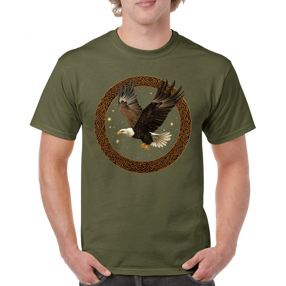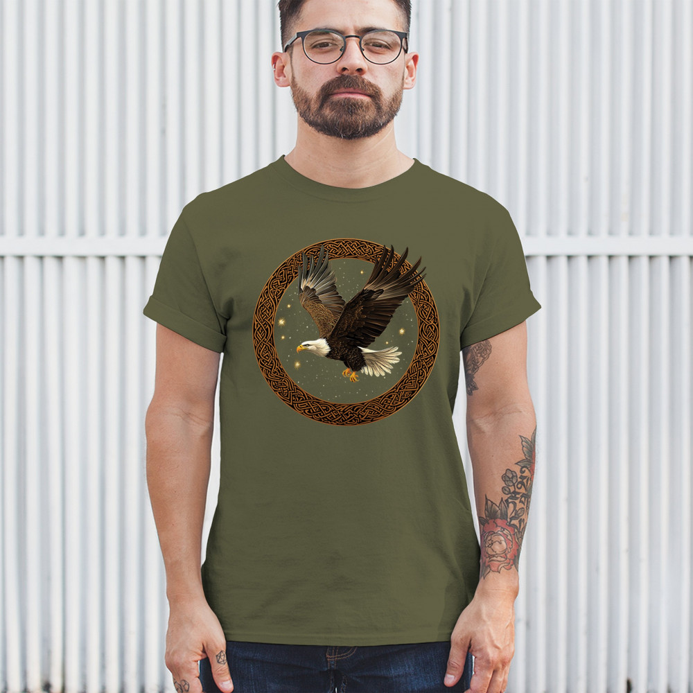 This powerful bald eagle takes flight within a Celtic knotwork circle, radiating strength, independence, and cosmic energy. The glowing stars and celestial background add mystic symbolism, blending nature, tribal design, and spirituality. Perfect for patriots, spiritual seekers, and bird enthusiasts.