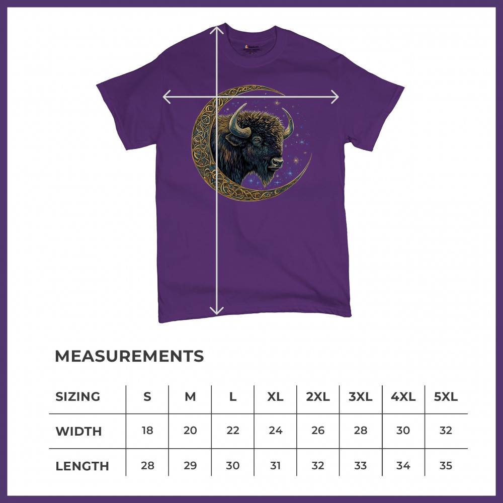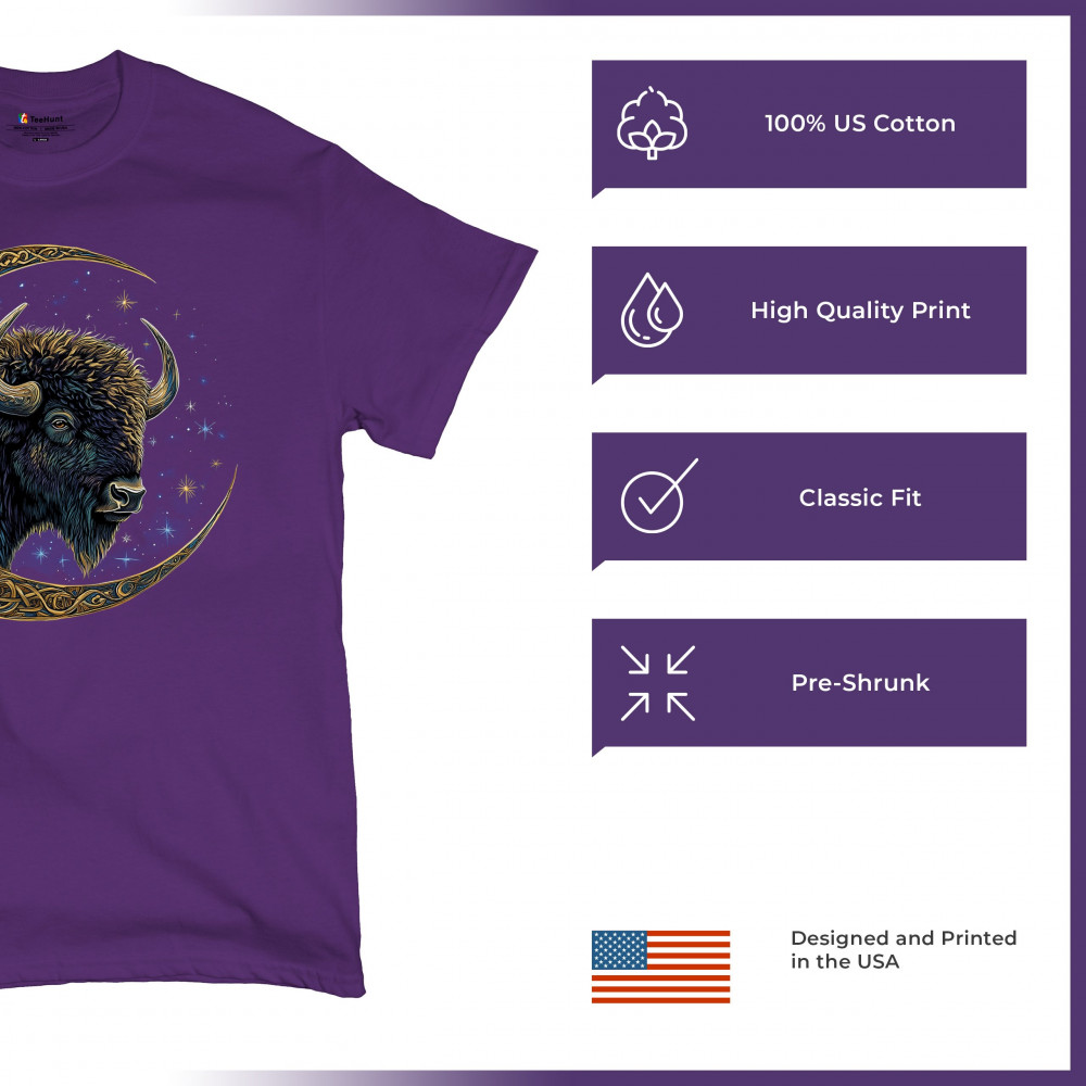 Celebrate strength, balance, and cosmic beauty with this powerful bison design. Framed by a Celtic crescent moon and surrounded by stars, the artwork merges tribal symbolism, animal energy, and nature’s majesty. A perfect choice for spiritual seekers, art lovers, stargazers, and fans of ancient folklore and cosmic connection.