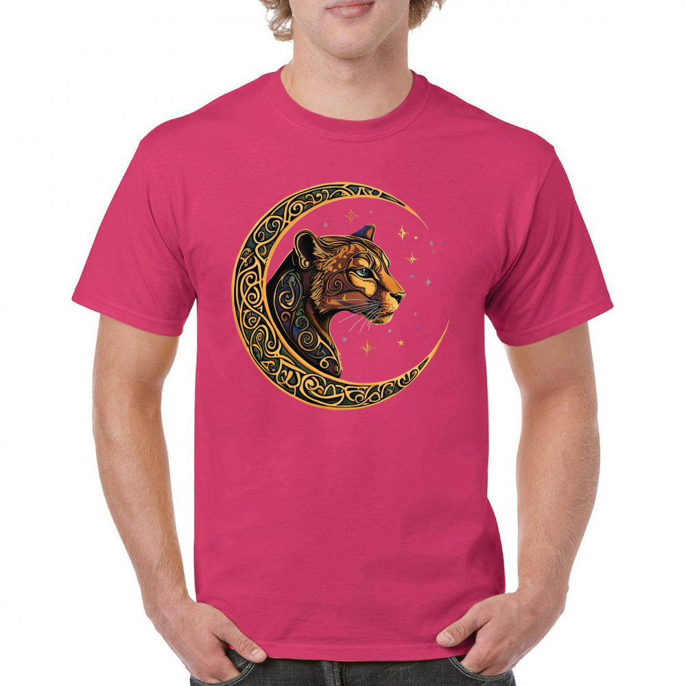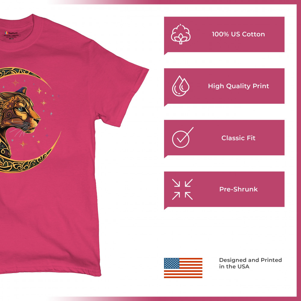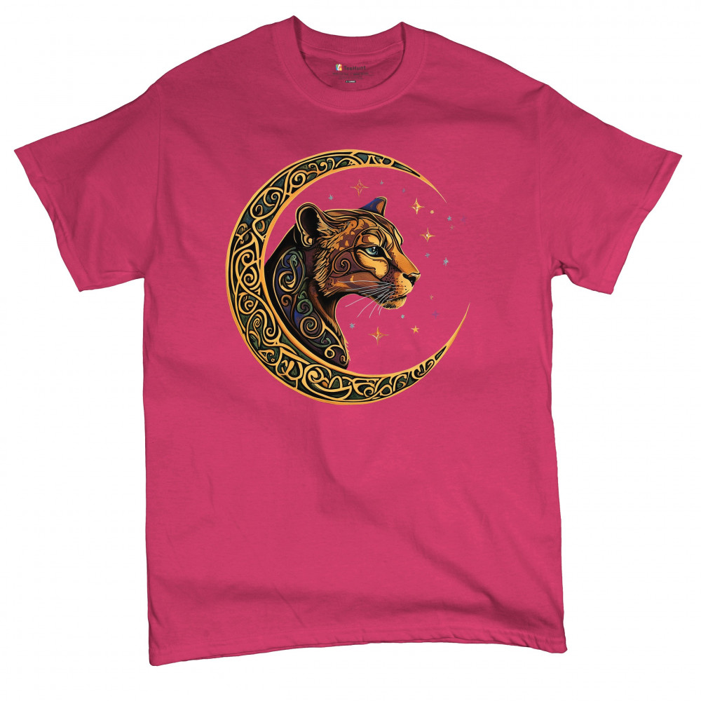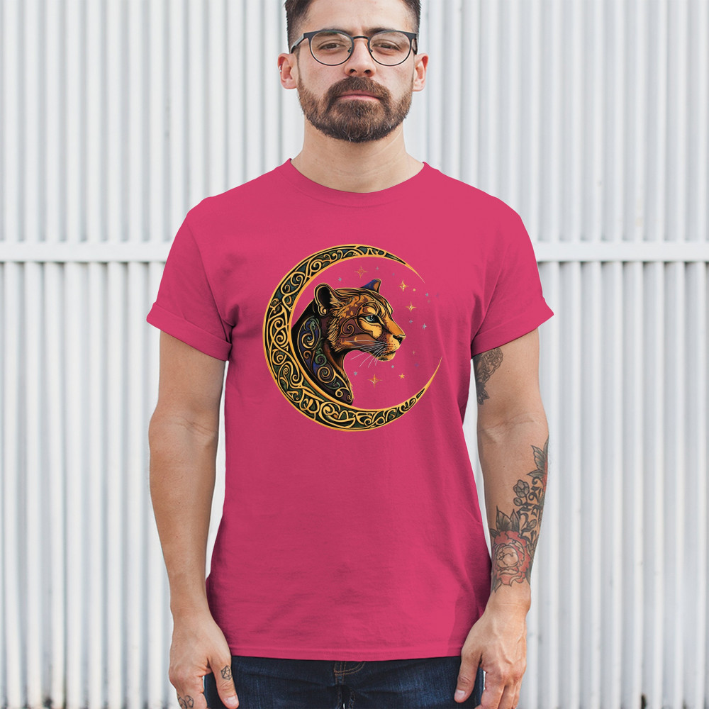 Mystical and elegant, this celestial leopard design merges wild animal strength with spiritual energy. Framed by a golden Celtic crescent moon and set against a starlit sky, it captures themes of nature, intuition, tribal symbolism, fantasy, and feminine power. Ideal for astrology fans, animal lovers, and seekers of cosmic connection.