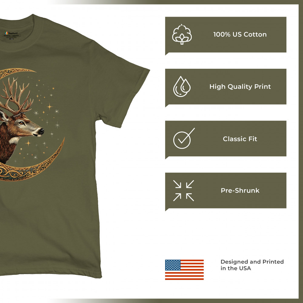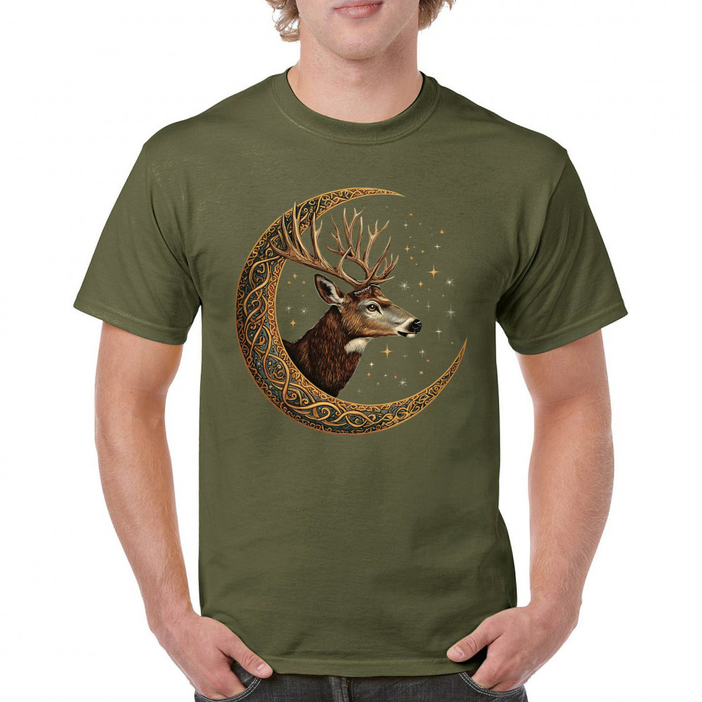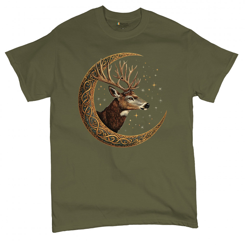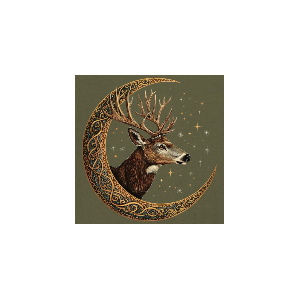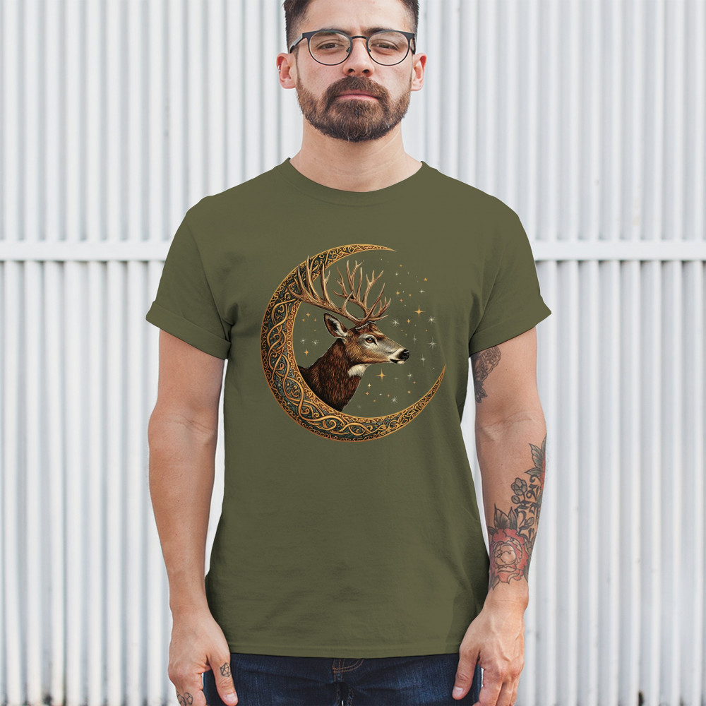 Majestic deer in Celtic moon with stars—symbol of protection, nature, and cosmic wisdom. A mystical gift for hunters, druids, and forest lovers.