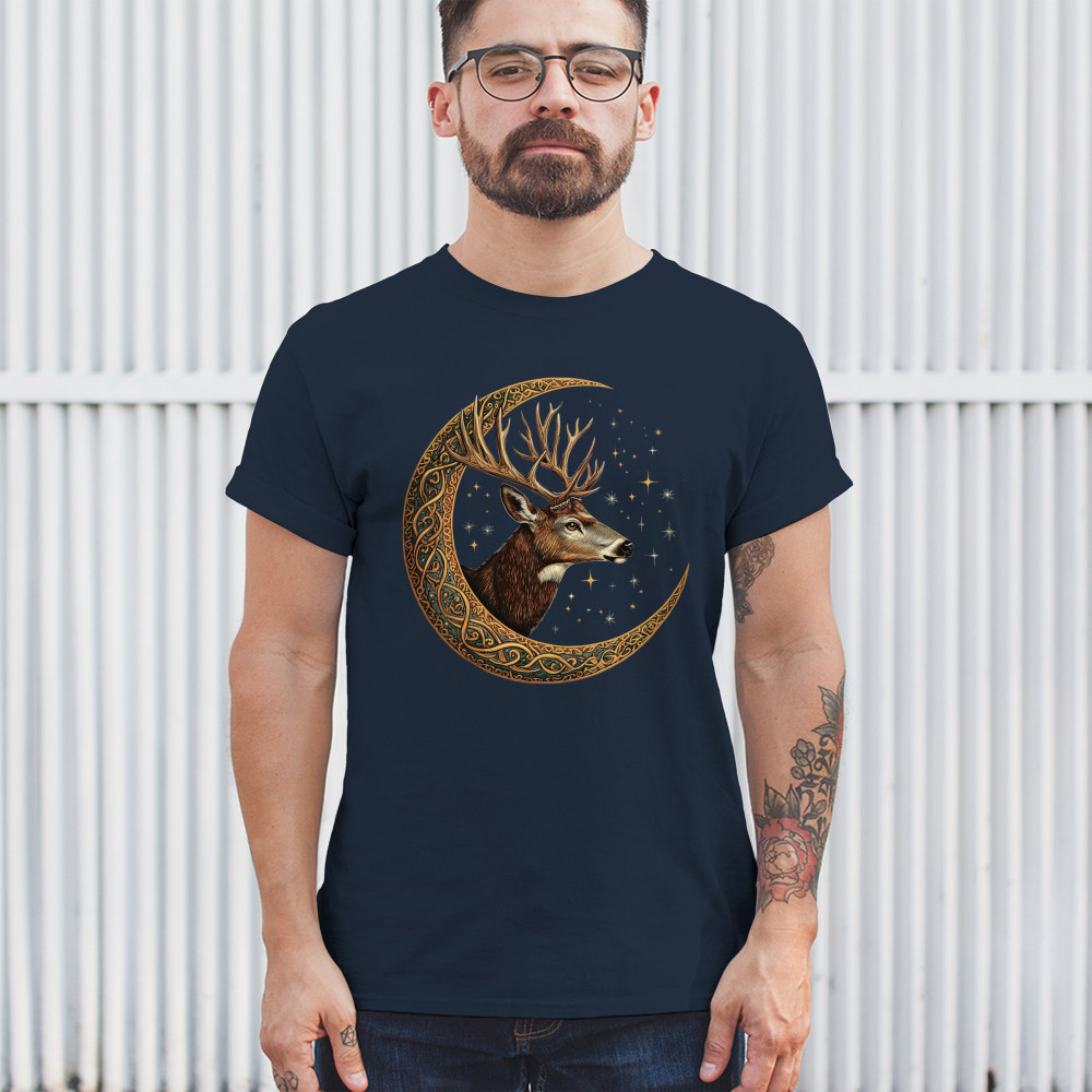 Majestic deer in Celtic moon with stars—symbol of protection, nature, and cosmic wisdom. A mystical gift for hunters, druids, and forest lovers.