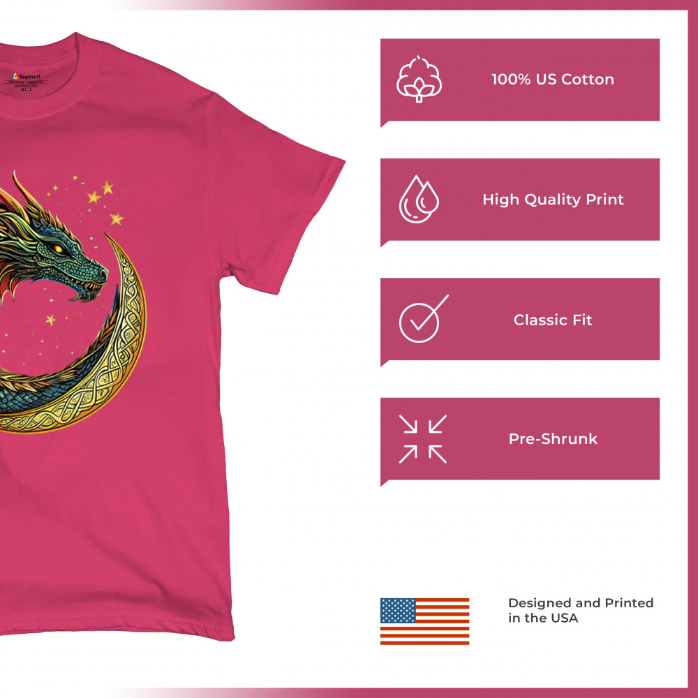 Fierce dragon in Celtic crescent moon with glowing eyes and starry sky. Perfect for fantasy fans, gamers, and spiritual warriors seeking mythic art.