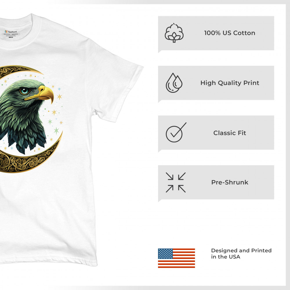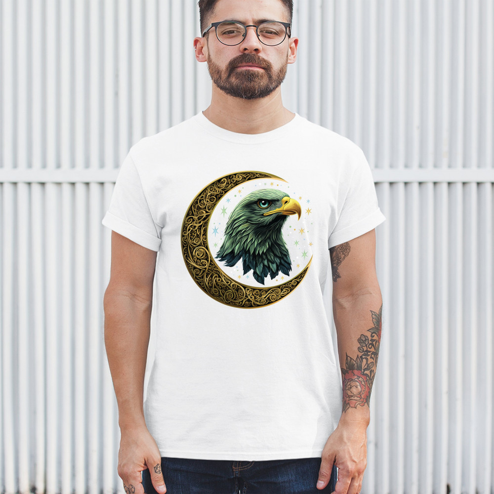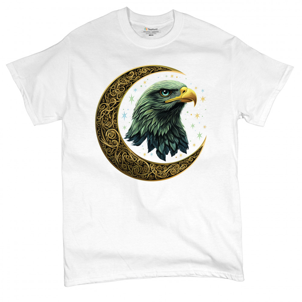 Majestic eagle in golden Celtic moon with stars—symbol of strength, vision, and freedom. Perfect for patriots, spiritual seekers, and nature lovers.