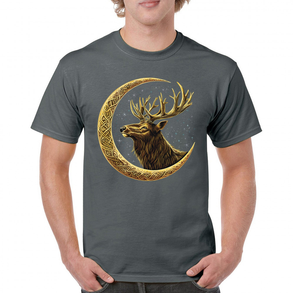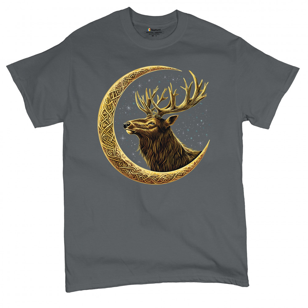 Celtic stag design with golden moon and cosmic stars. Symbolizes forest strength, leadership, and spiritual energy. Perfect for nature lovers.
