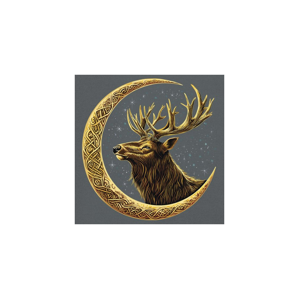 A majestic stag with bold antlers is framed by a glowing golden Celtic moon, set against a mystical night sky. This powerful image symbolizes strength, leadership, and spiritual connection to the forest. Perfect for fantasy fans, spiritual seekers, hunters, or anyone who honors nature, tribal themes, and cosmic symbolism.