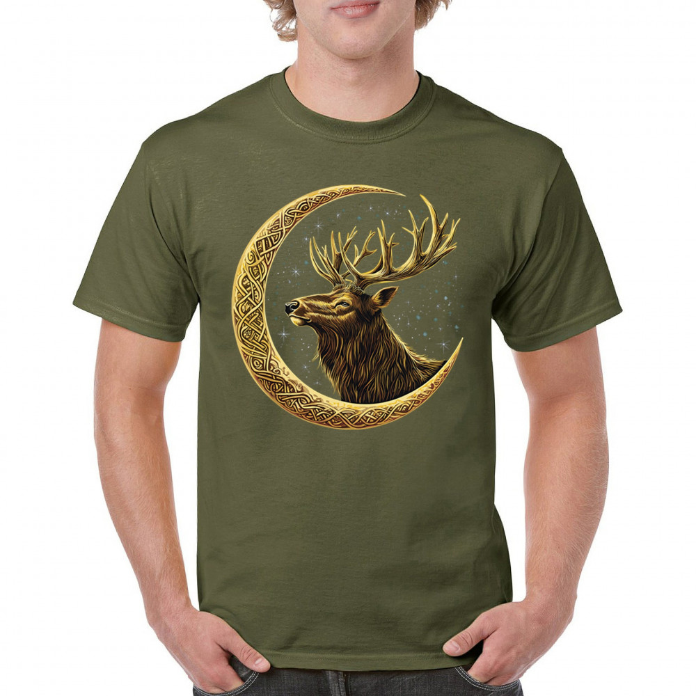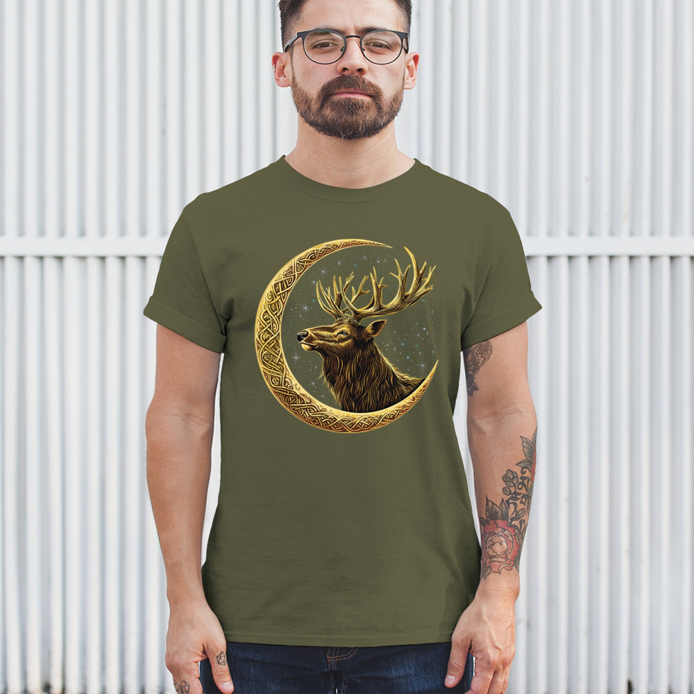 Celtic stag design with golden moon and cosmic stars. Symbolizes forest strength, leadership, and spiritual energy. Perfect for nature lovers.