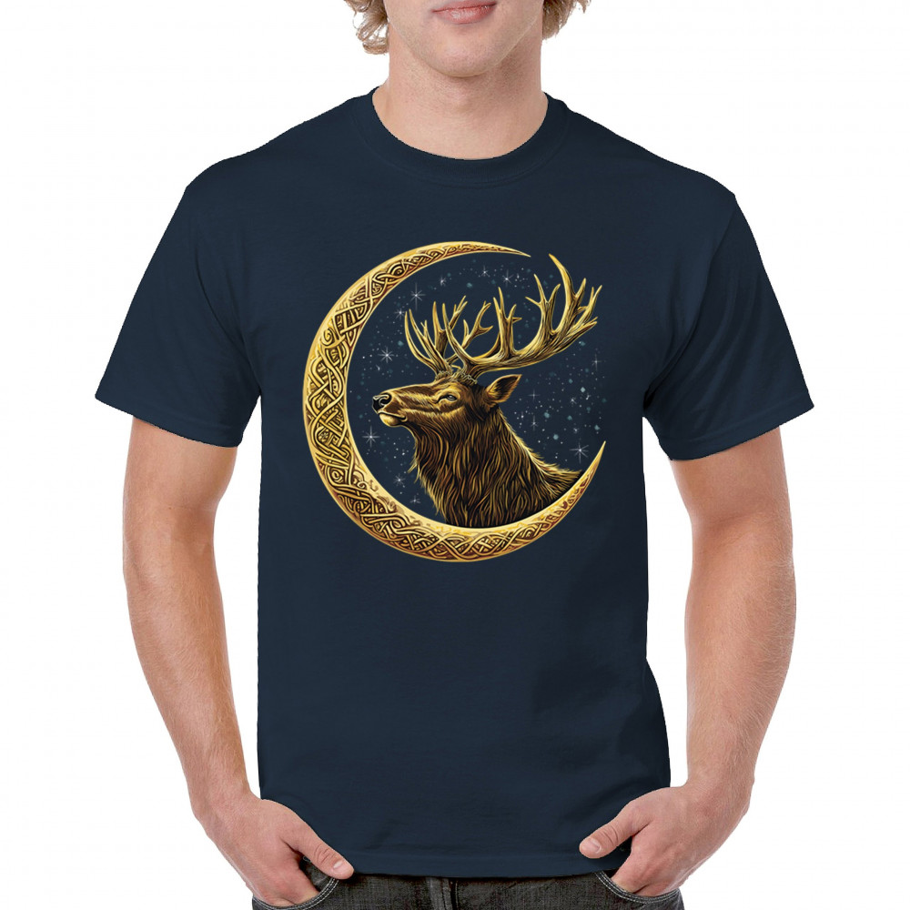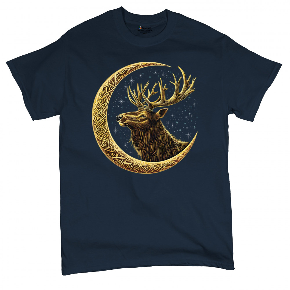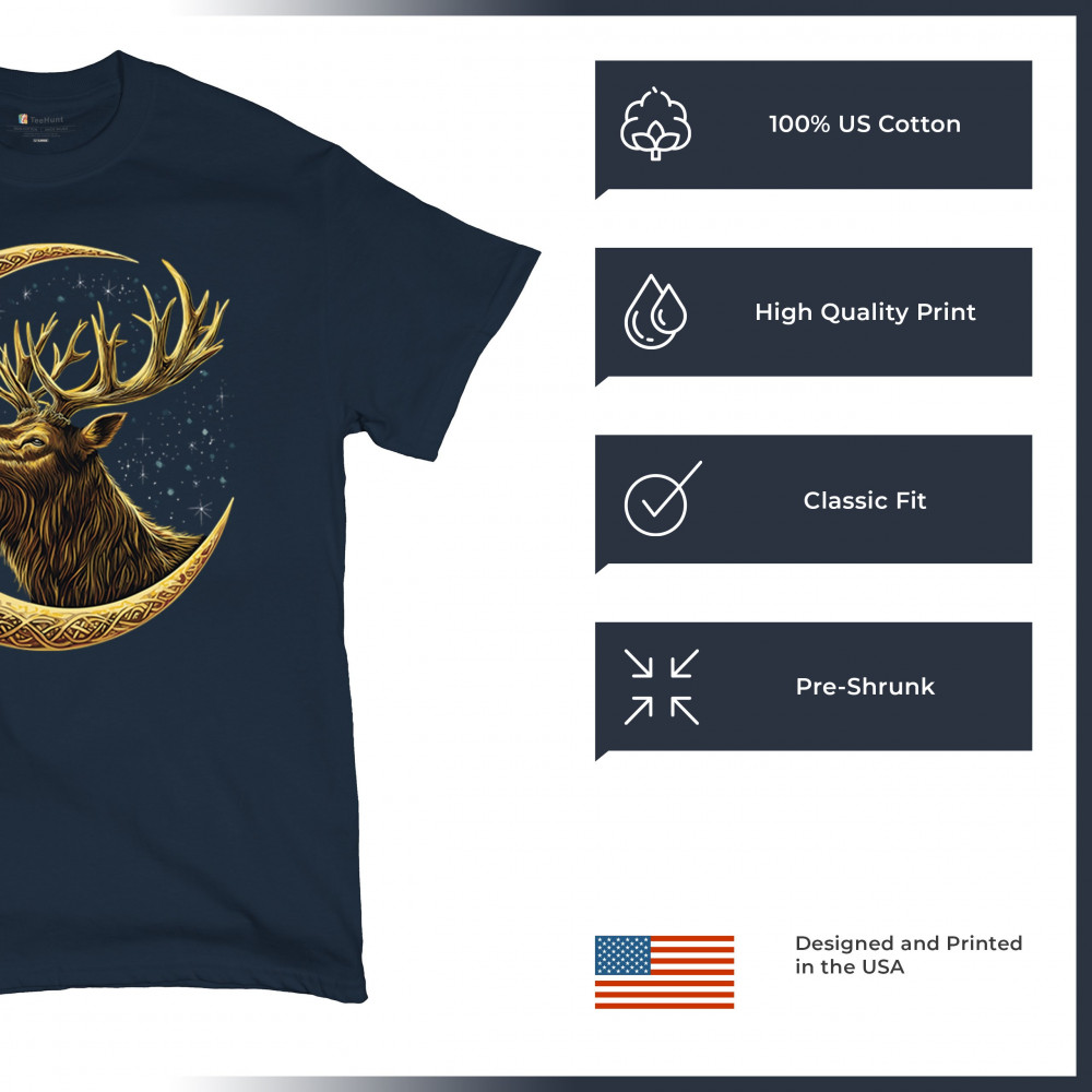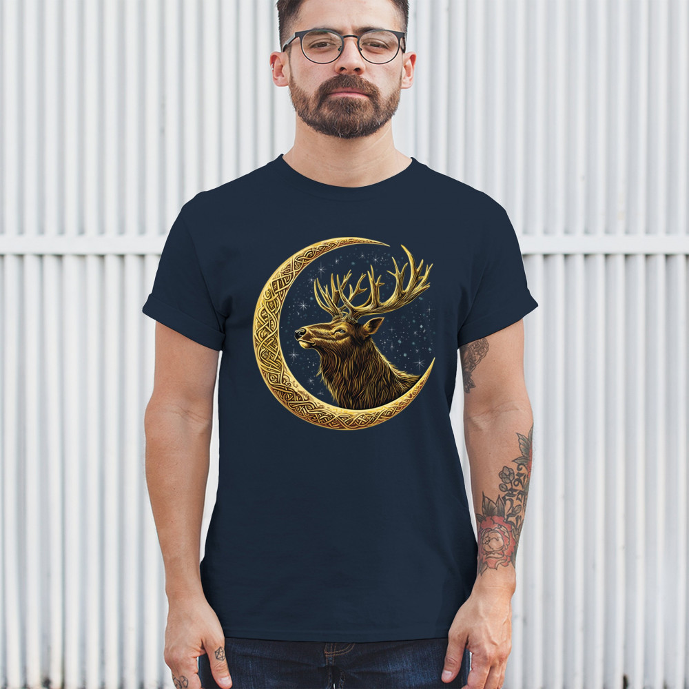 Celtic stag design with golden moon and cosmic stars. Symbolizes forest strength, leadership, and spiritual energy. Perfect for nature lovers.