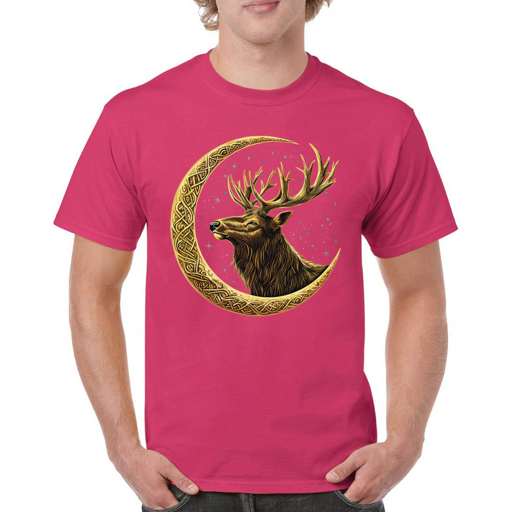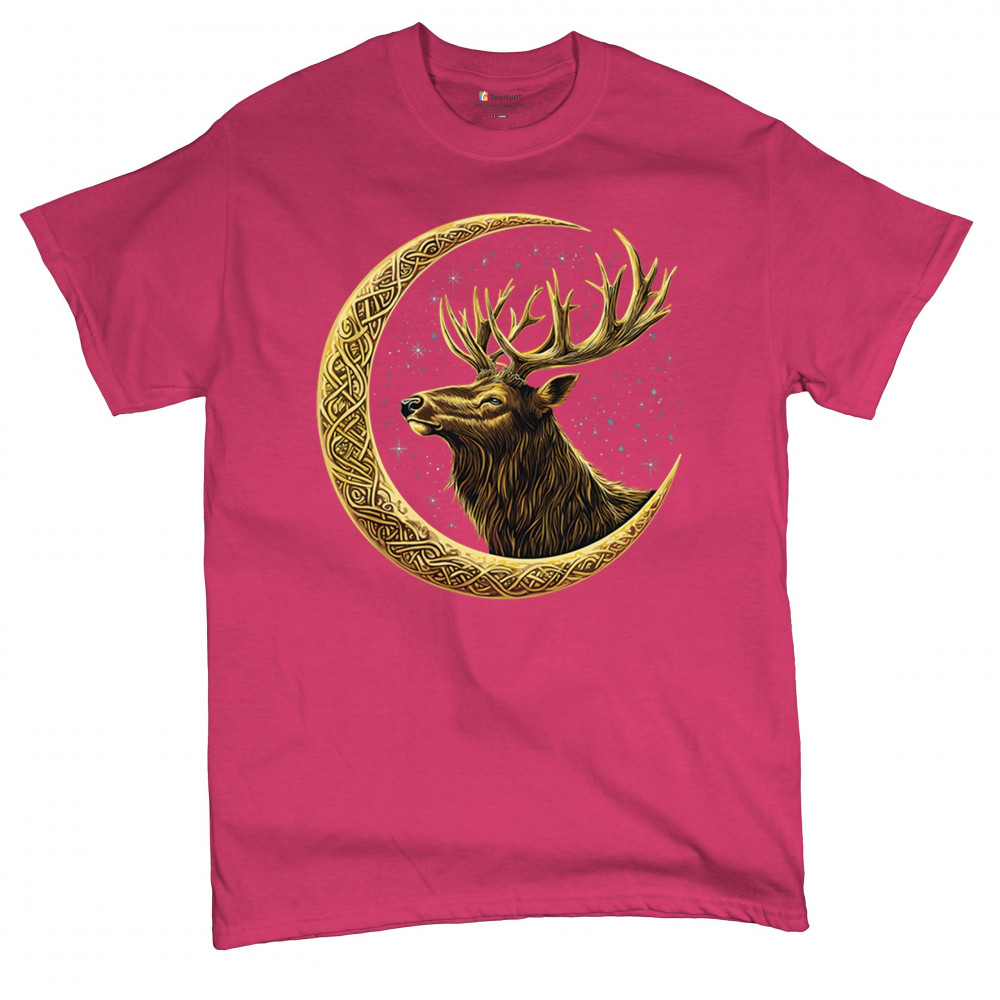 Celtic stag design with golden moon and cosmic stars. Symbolizes forest strength, leadership, and spiritual energy. Perfect for nature lovers.