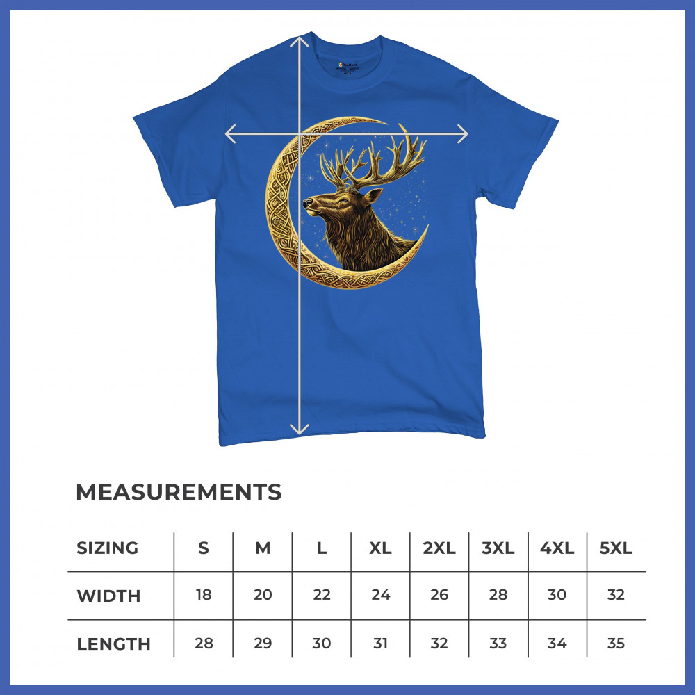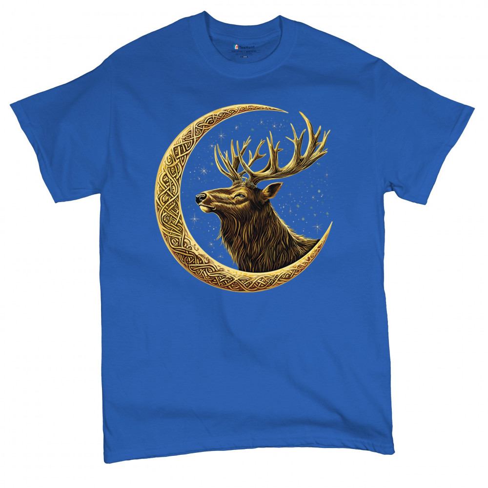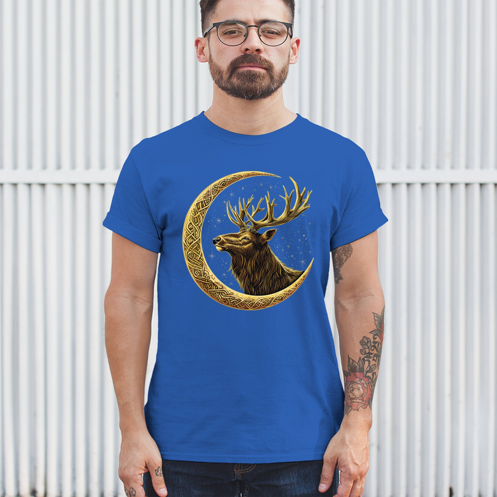 Celtic stag design with golden moon and cosmic stars. Symbolizes forest strength, leadership, and spiritual energy. Perfect for nature lovers.