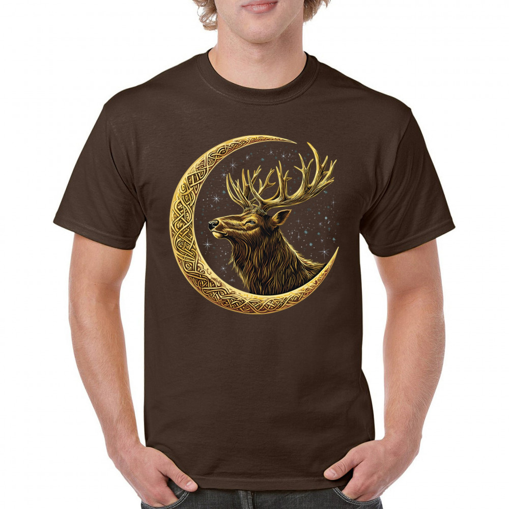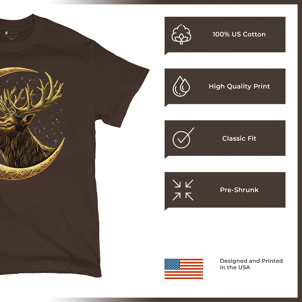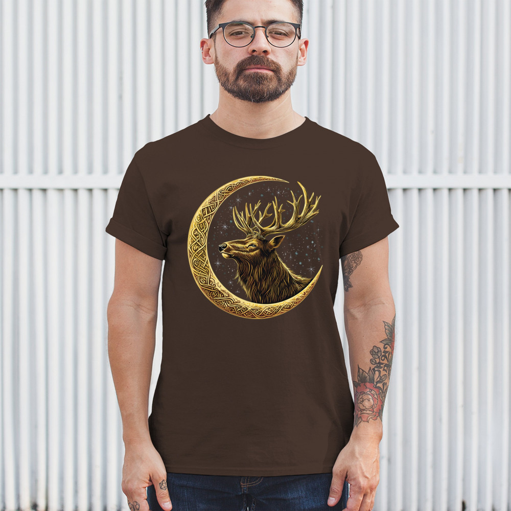 Celtic stag design with golden moon and cosmic stars. Symbolizes forest strength, leadership, and spiritual energy. Perfect for nature lovers.