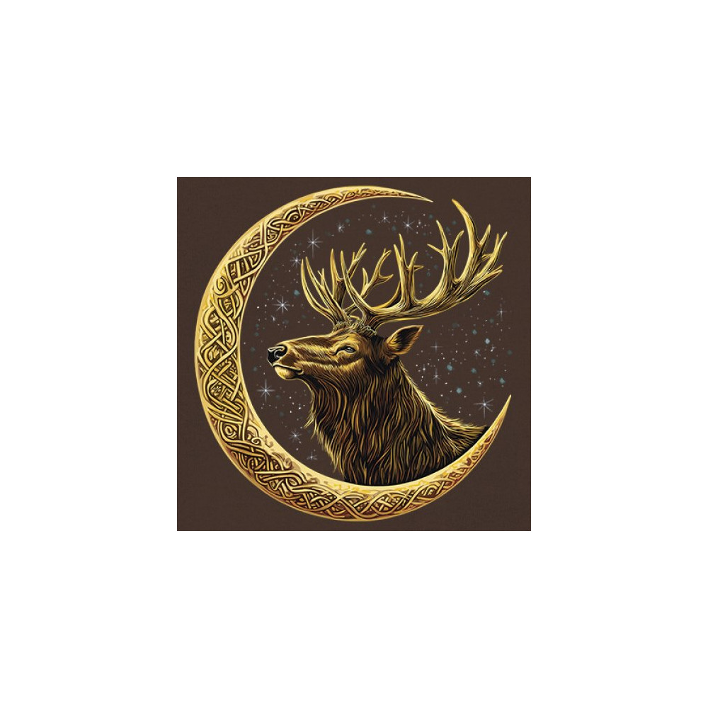 A majestic stag with bold antlers is framed by a glowing golden Celtic moon, set against a mystical night sky. This powerful image symbolizes strength, leadership, and spiritual connection to the forest. Perfect for fantasy fans, spiritual seekers, hunters, or anyone who honors nature, tribal themes, and cosmic symbolism.