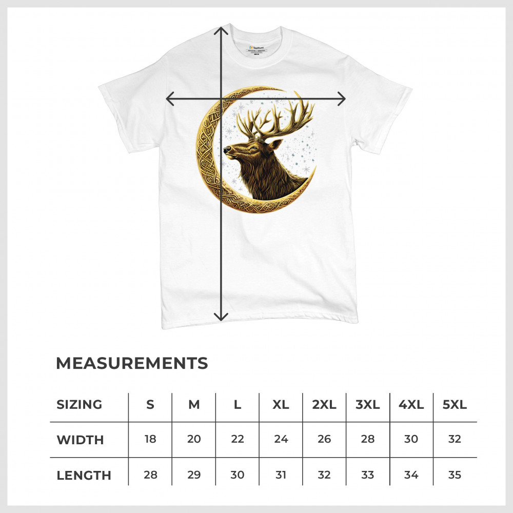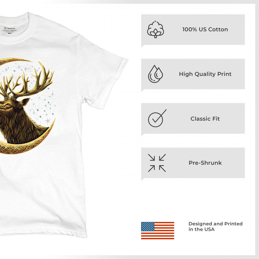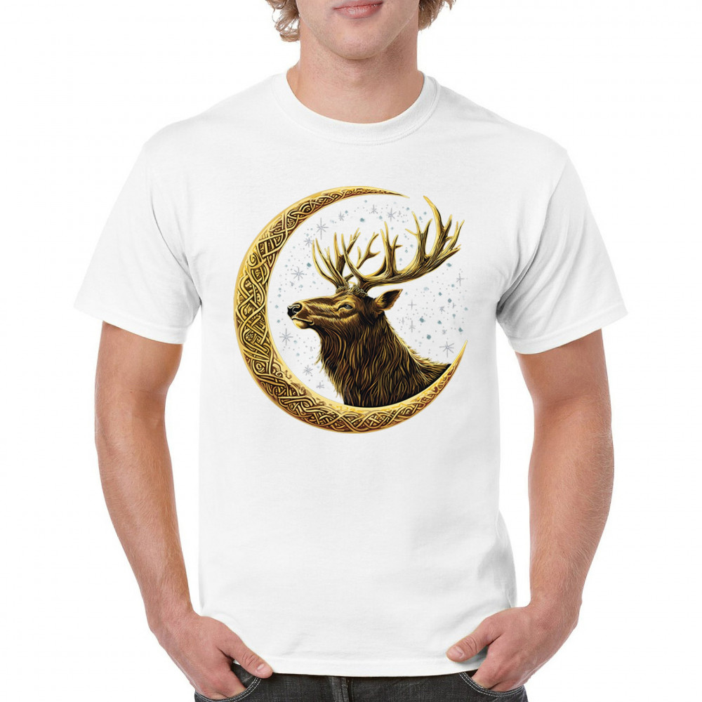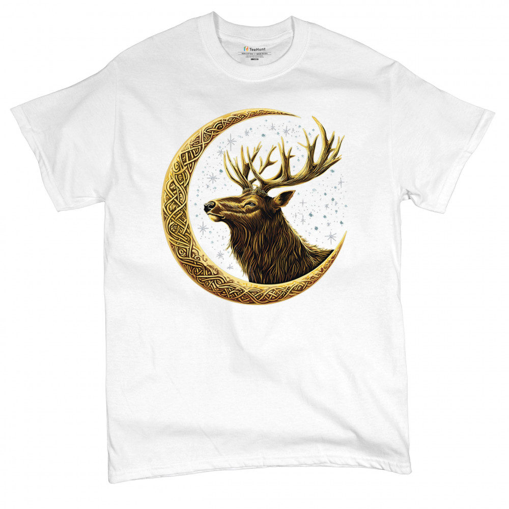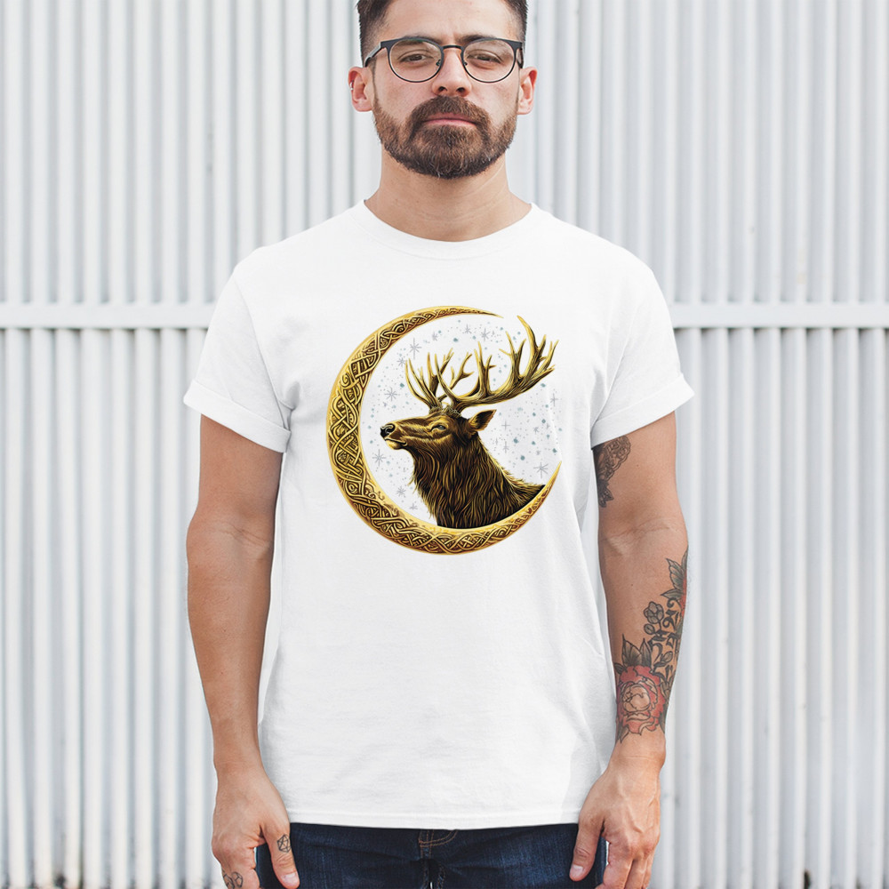 Celtic stag design with golden moon and cosmic stars. Symbolizes forest strength, leadership, and spiritual energy. Perfect for nature lovers.
