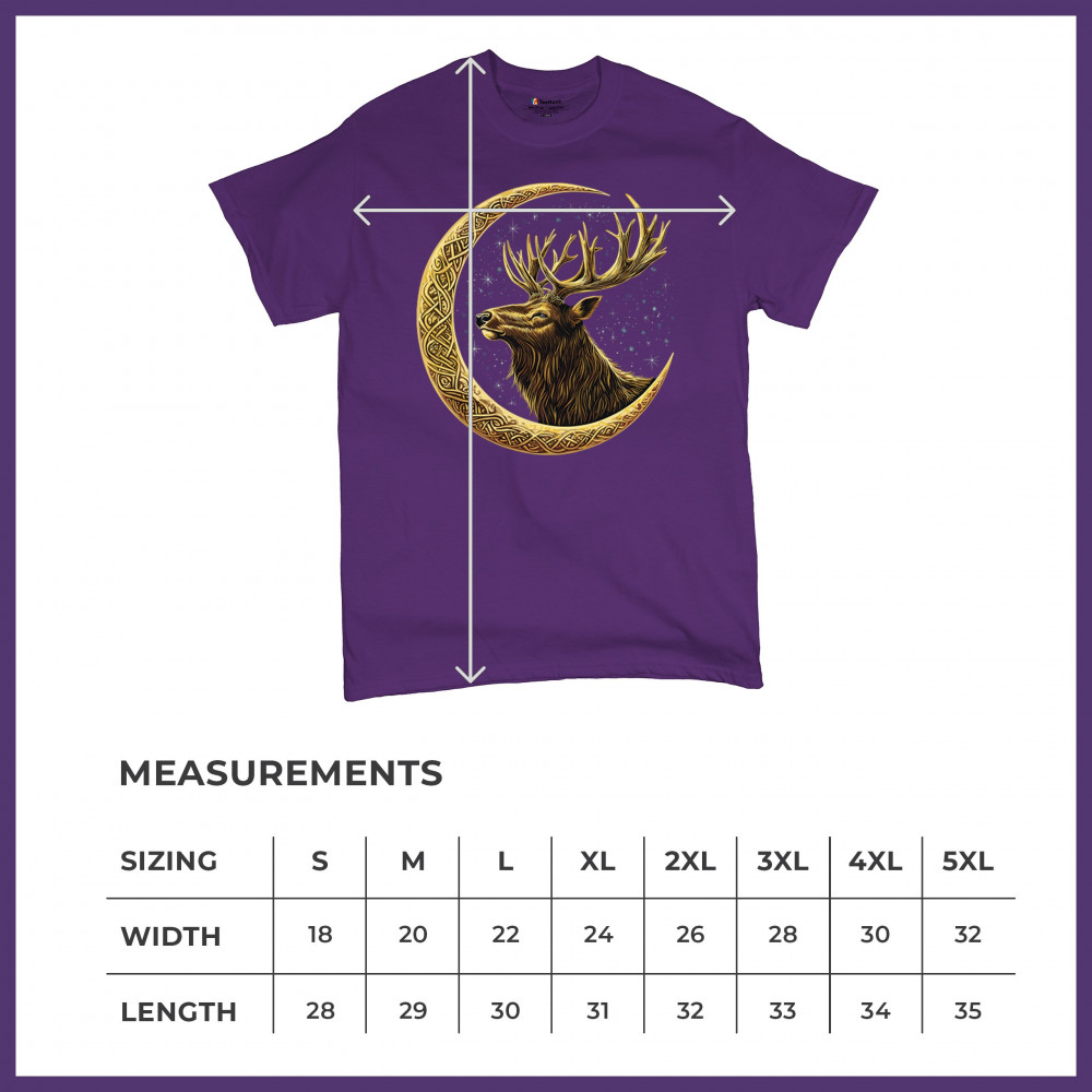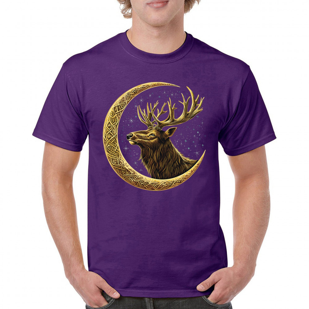 Celtic stag design with golden moon and cosmic stars. Symbolizes forest strength, leadership, and spiritual energy. Perfect for nature lovers.
