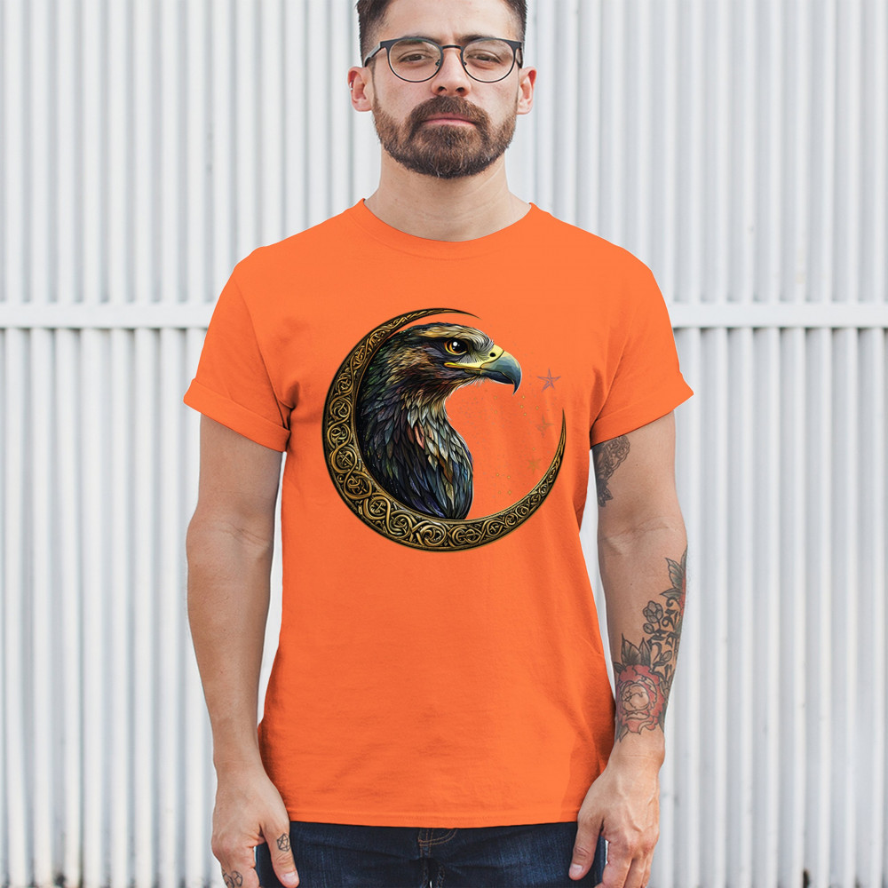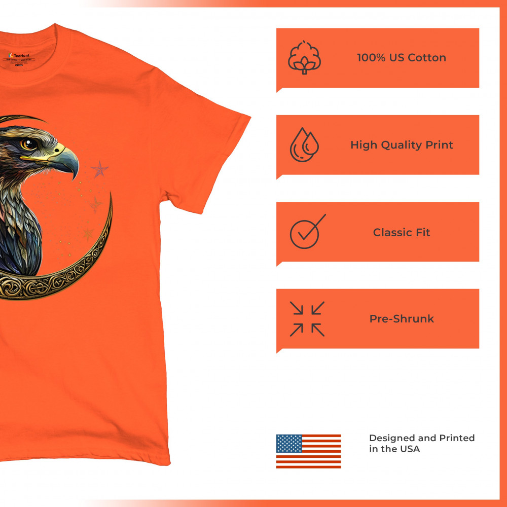 A beautifully detailed eagle with vibrant feathers is framed by a golden Celtic crescent moon and surrounded by a starry cosmic sky. This striking design represents freedom, spiritual power, and the mystery of the skies. Perfect for patriots, bird lovers, and those who connect with nature, tribal symbolism, and celestial art.