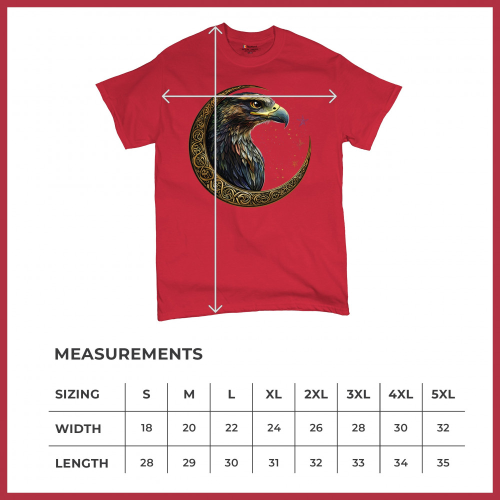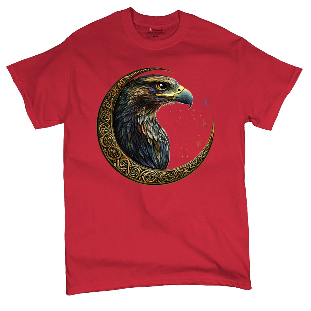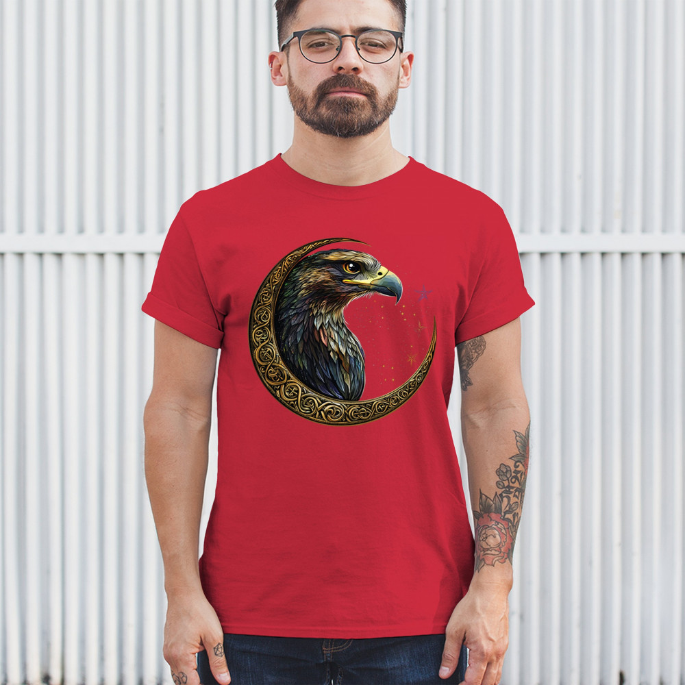 A beautifully detailed eagle with vibrant feathers is framed by a golden Celtic crescent moon and surrounded by a starry cosmic sky. This striking design represents freedom, spiritual power, and the mystery of the skies. Perfect for patriots, bird lovers, and those who connect with nature, tribal symbolism, and celestial art.