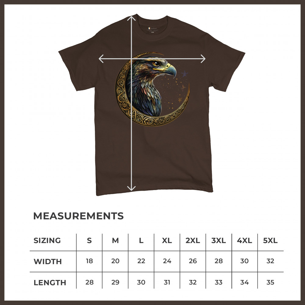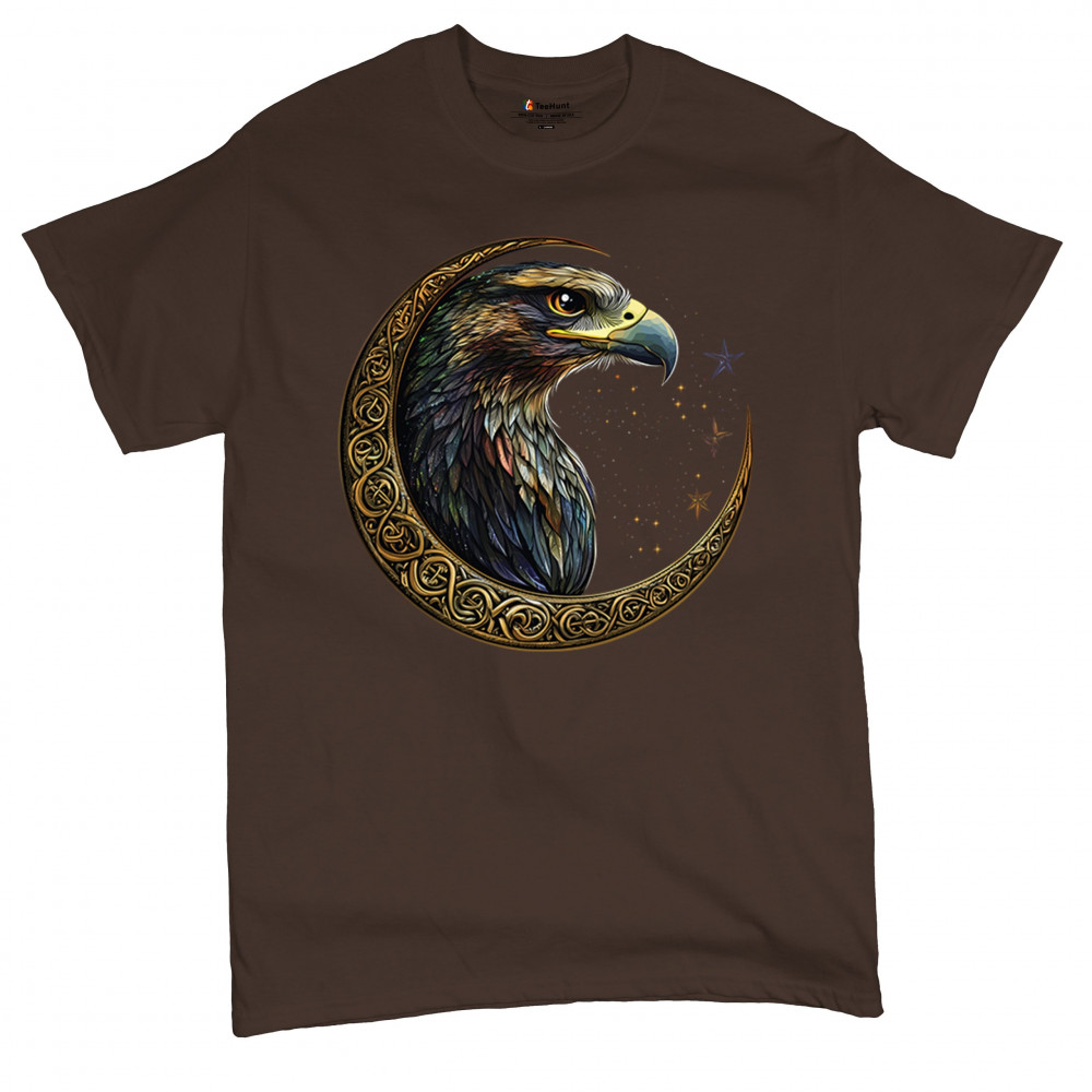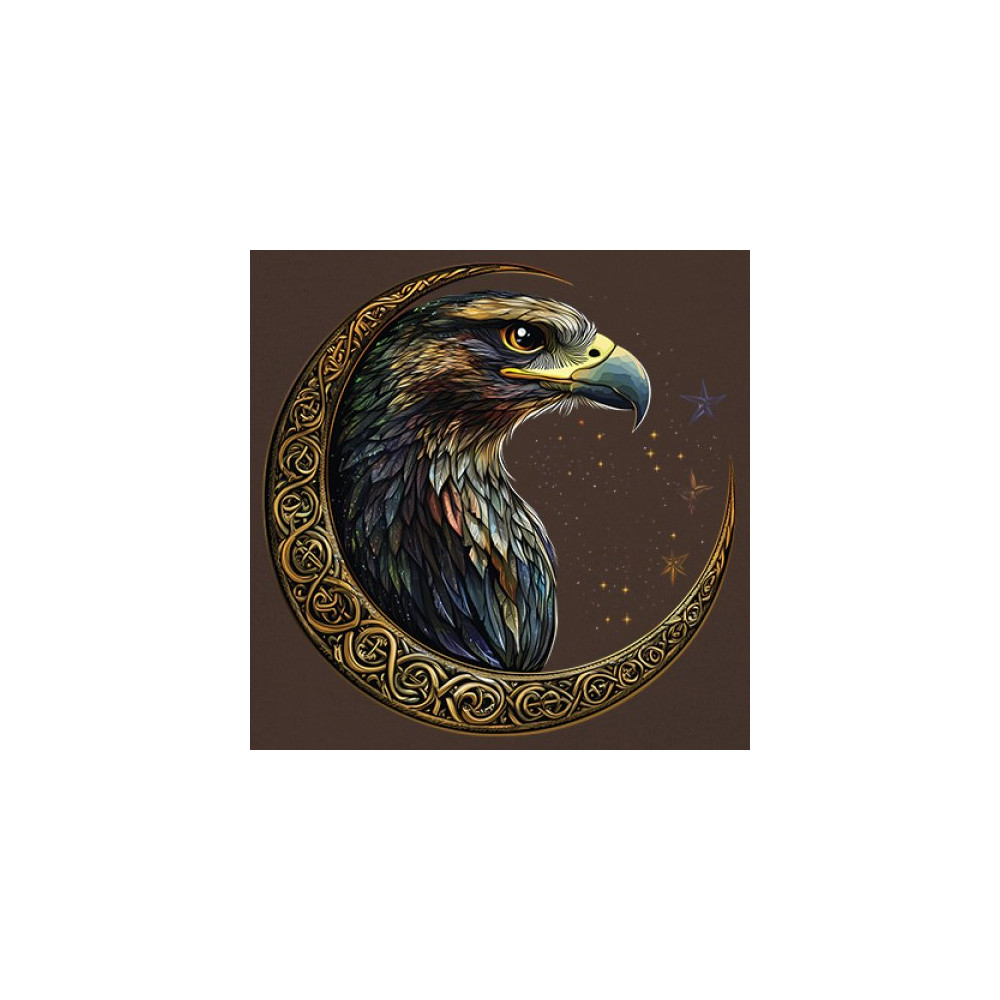 A beautifully detailed eagle with vibrant feathers is framed by a golden Celtic crescent moon and surrounded by a starry cosmic sky. This striking design represents freedom, spiritual power, and the mystery of the skies. Perfect for patriots, bird lovers, and those who connect with nature, tribal symbolism, and celestial art.