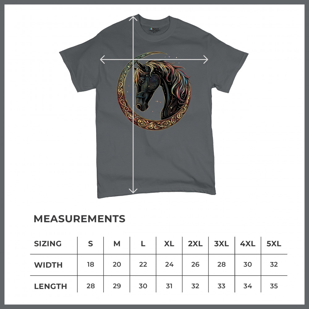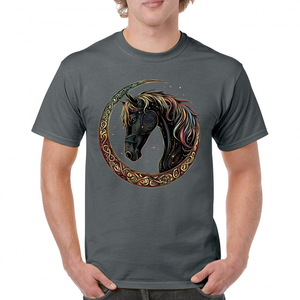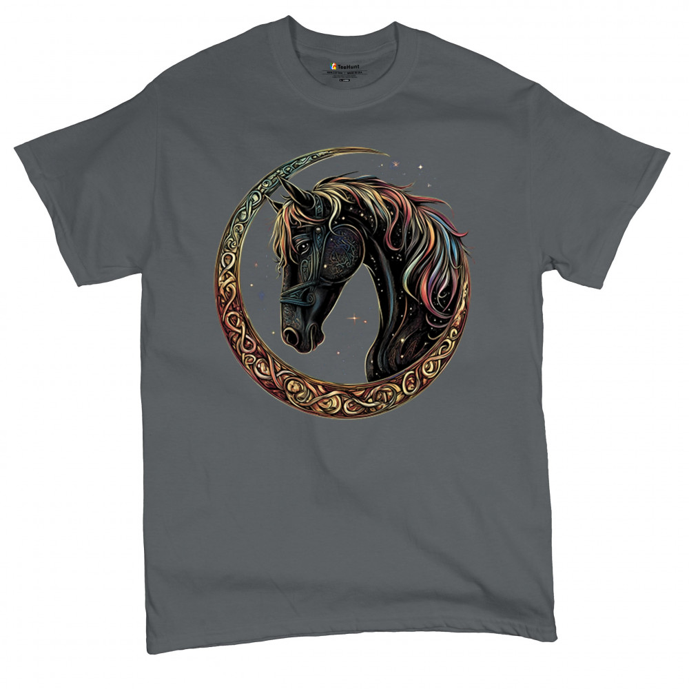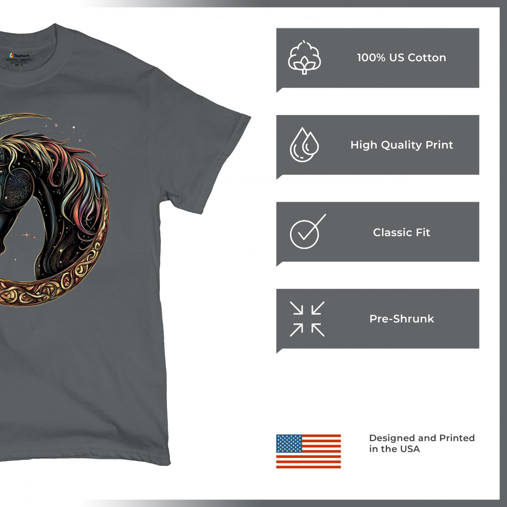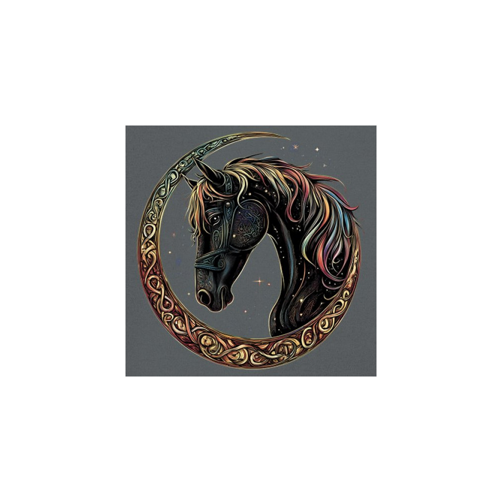 Celebrate the power and grace of the cosmos with this majestic black horse framed by a golden Celtic crescent moon. Its rainbow mane and celestial body symbolize strength, movement, mystery, and spiritual magic. A stunning piece for fantasy fans, equestrians, and dreamers who love horses and stars.