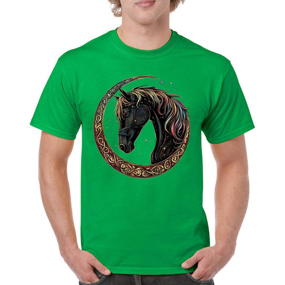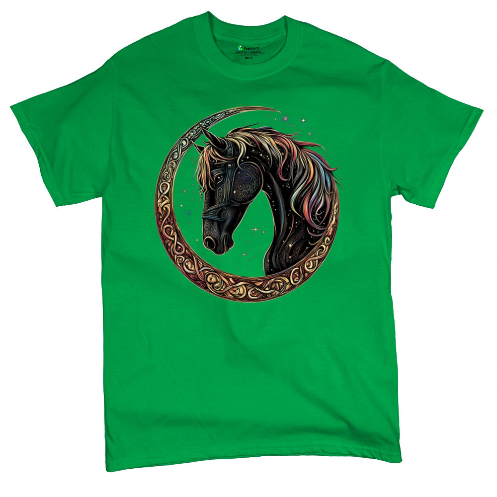 Celebrate the power and grace of the cosmos with this majestic black horse framed by a golden Celtic crescent moon. Its rainbow mane and celestial body symbolize strength, movement, mystery, and spiritual magic. A stunning piece for fantasy fans, equestrians, and dreamers who love horses and stars.