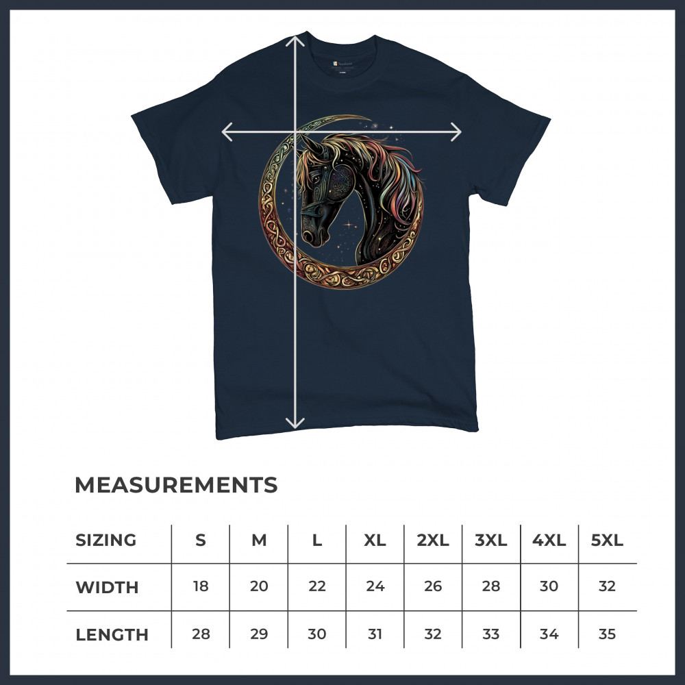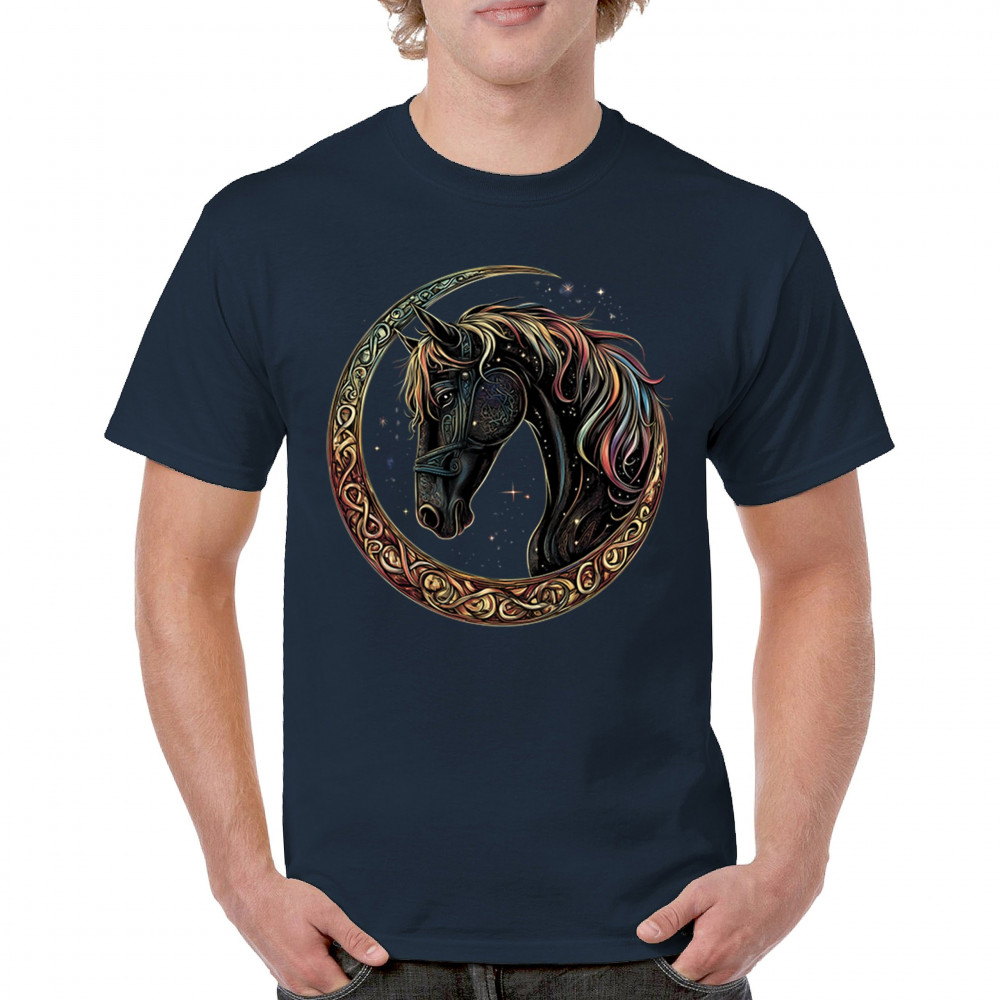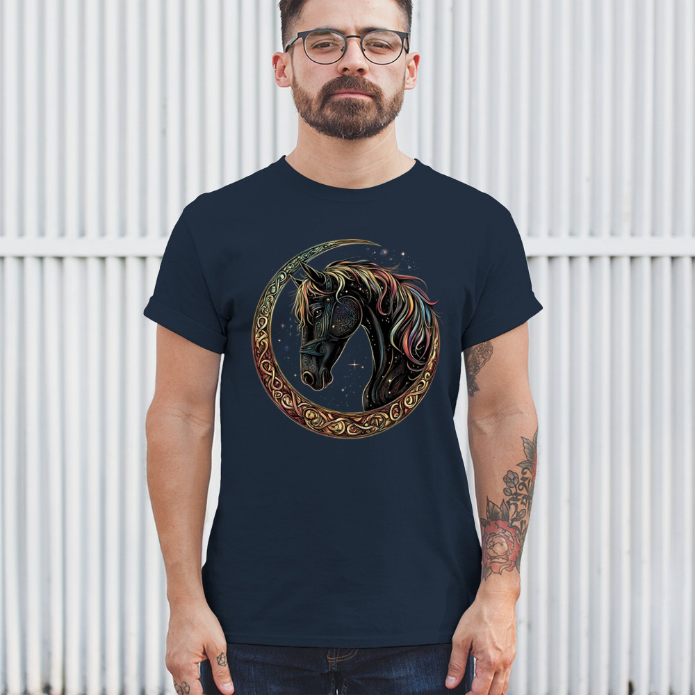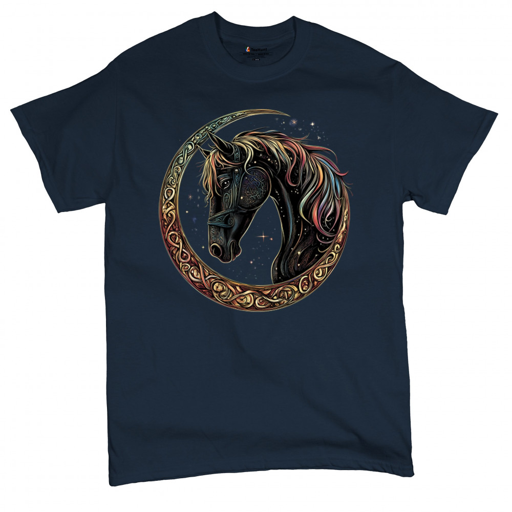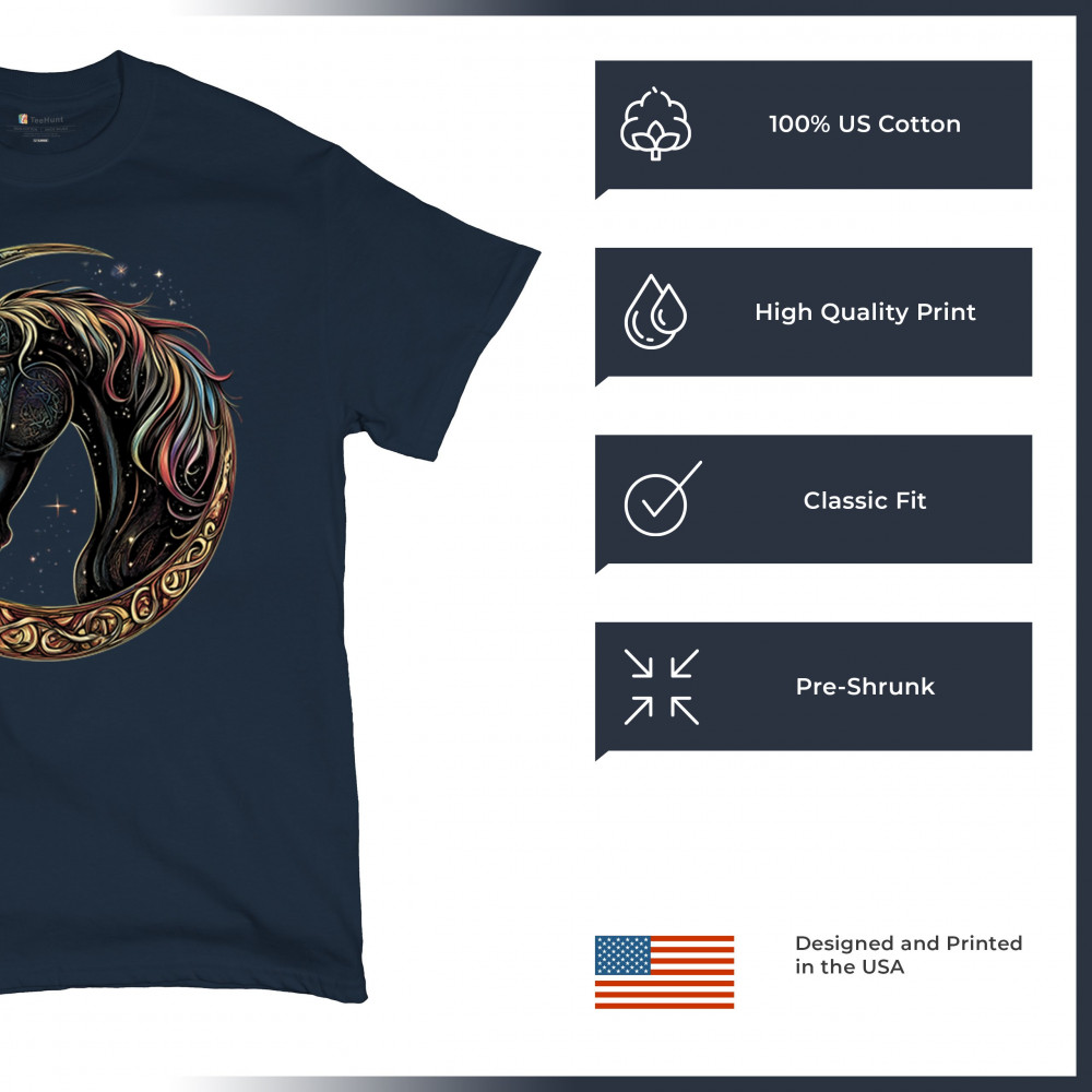 Celebrate the power and grace of the cosmos with this majestic black horse framed by a golden Celtic crescent moon. Its rainbow mane and celestial body symbolize strength, movement, mystery, and spiritual magic. A stunning piece for fantasy fans, equestrians, and dreamers who love horses and stars.